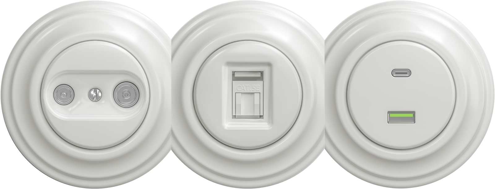 • Kliklap - Retro stiliaus TV+R (galinis) antenos lizdas be rėmo, keraminis, baltas