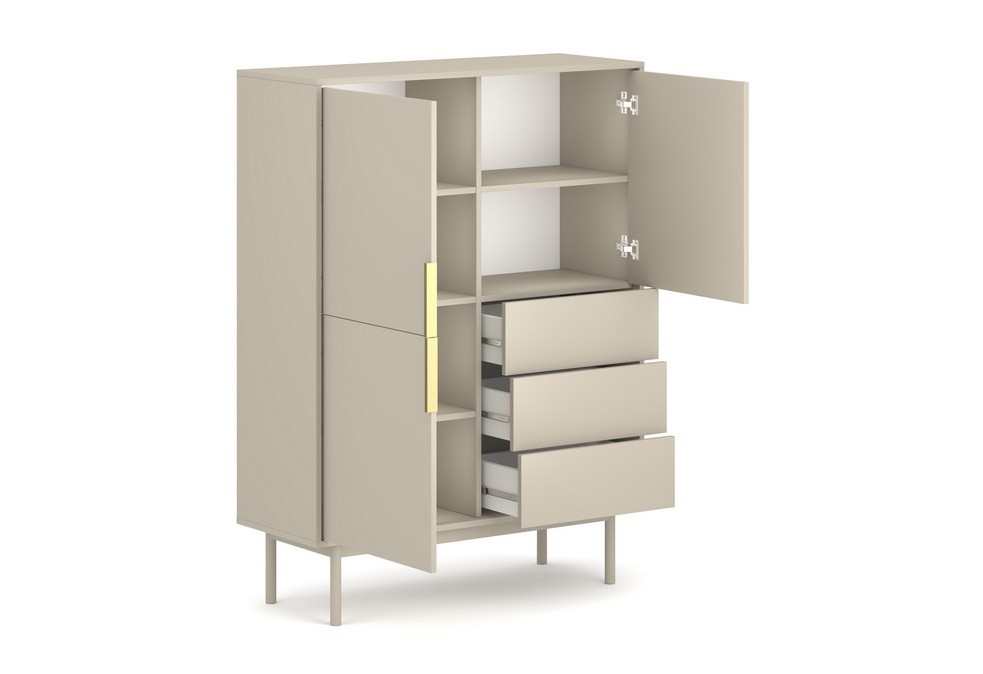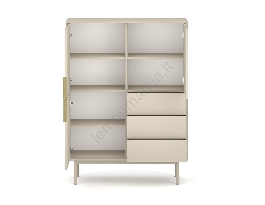 • Kairėje yra dvejos durelės, dešinėje — vienos durelės ir trys stalčiai, skirti tvarkingam daiktų laikymui.