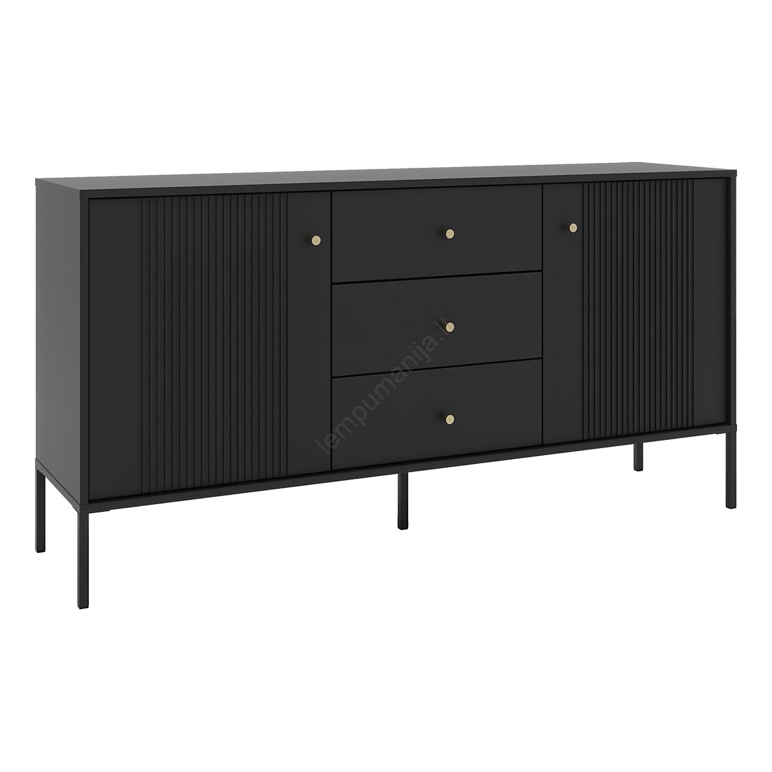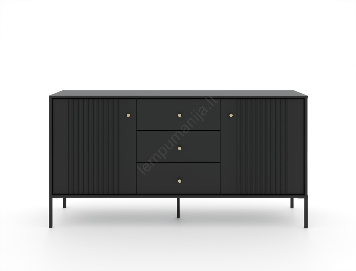 • Viduryje yra trys stalčiai, o taip pat dvi lentynėlės su durelėmis, puoštomis vertikaliomis briaunomis.