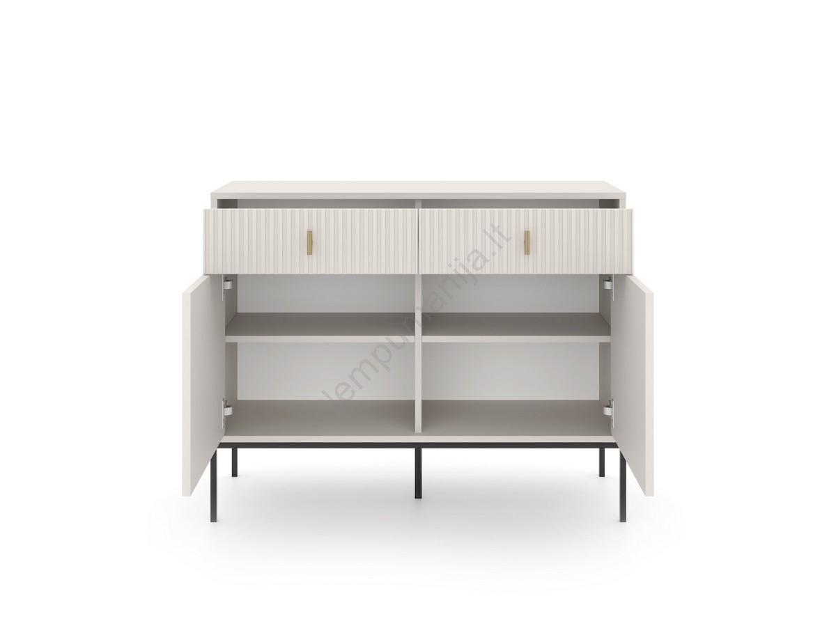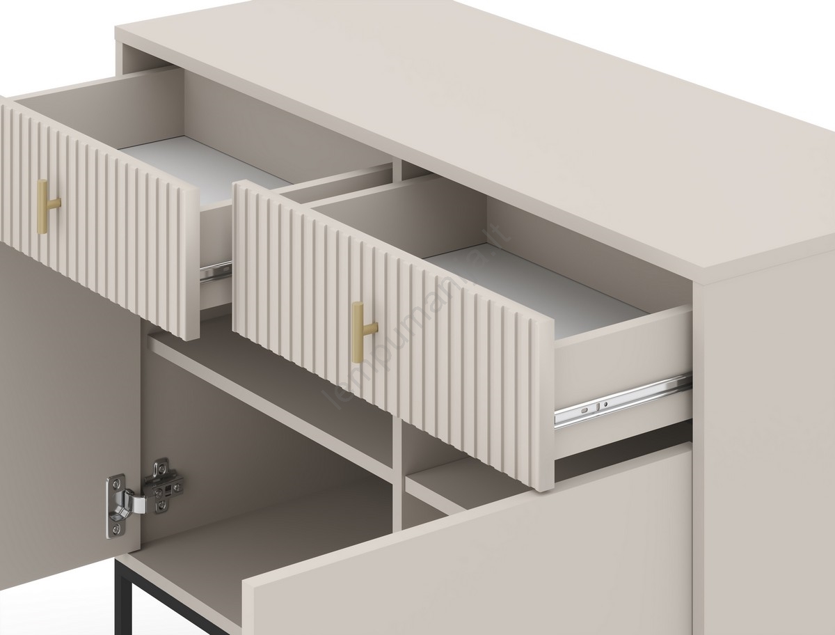 • Joje yra dvi apatinės durelės su erdviu sandėliavimo skyriumi ir du stalčiai su rankenomis bei vertikaliai profiliotu paviršiumi.