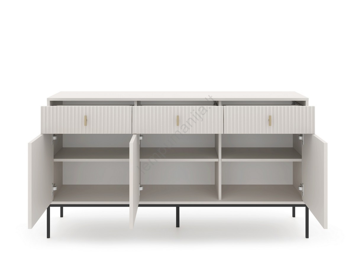 • Joje yra trys apatinės durelės su erdviu laikymo skyriumi ir trys stalčiai su rankenomis bei vertikaliu rievėjimu.