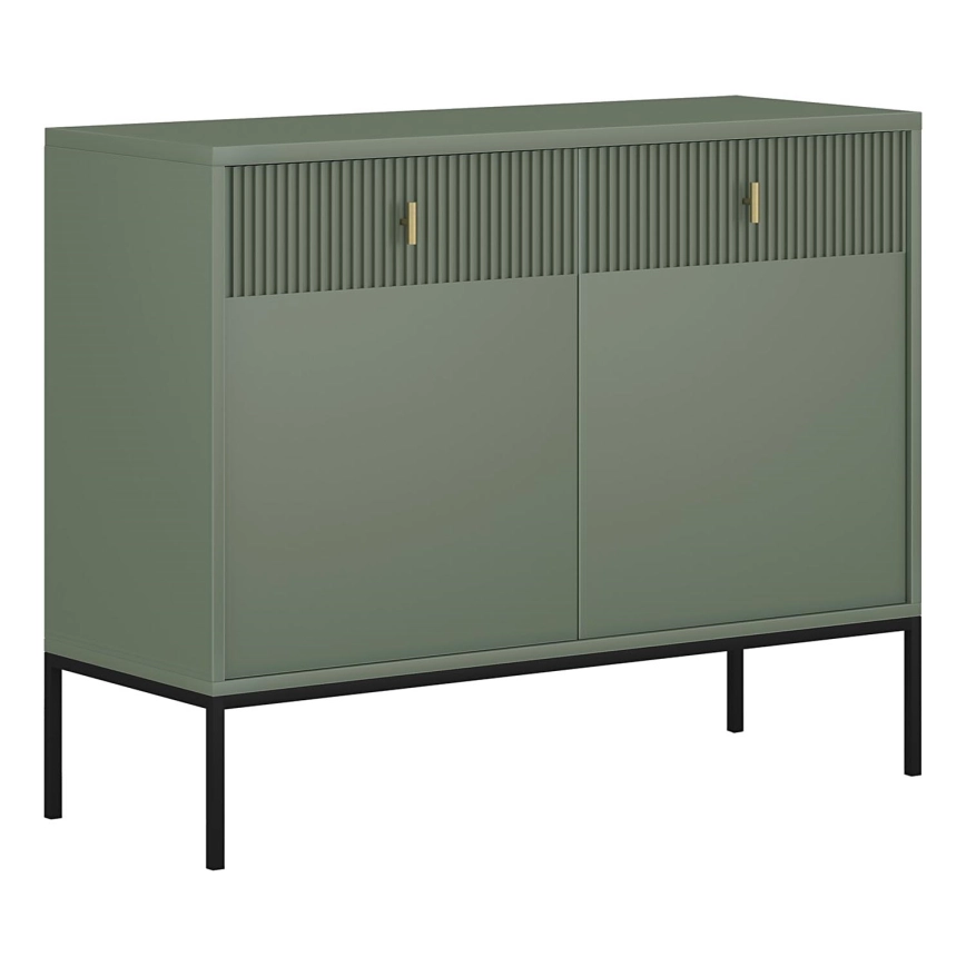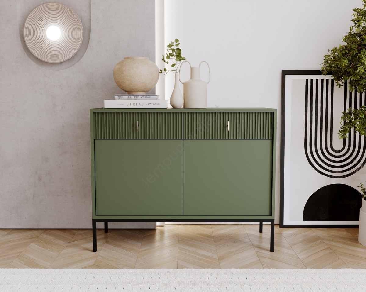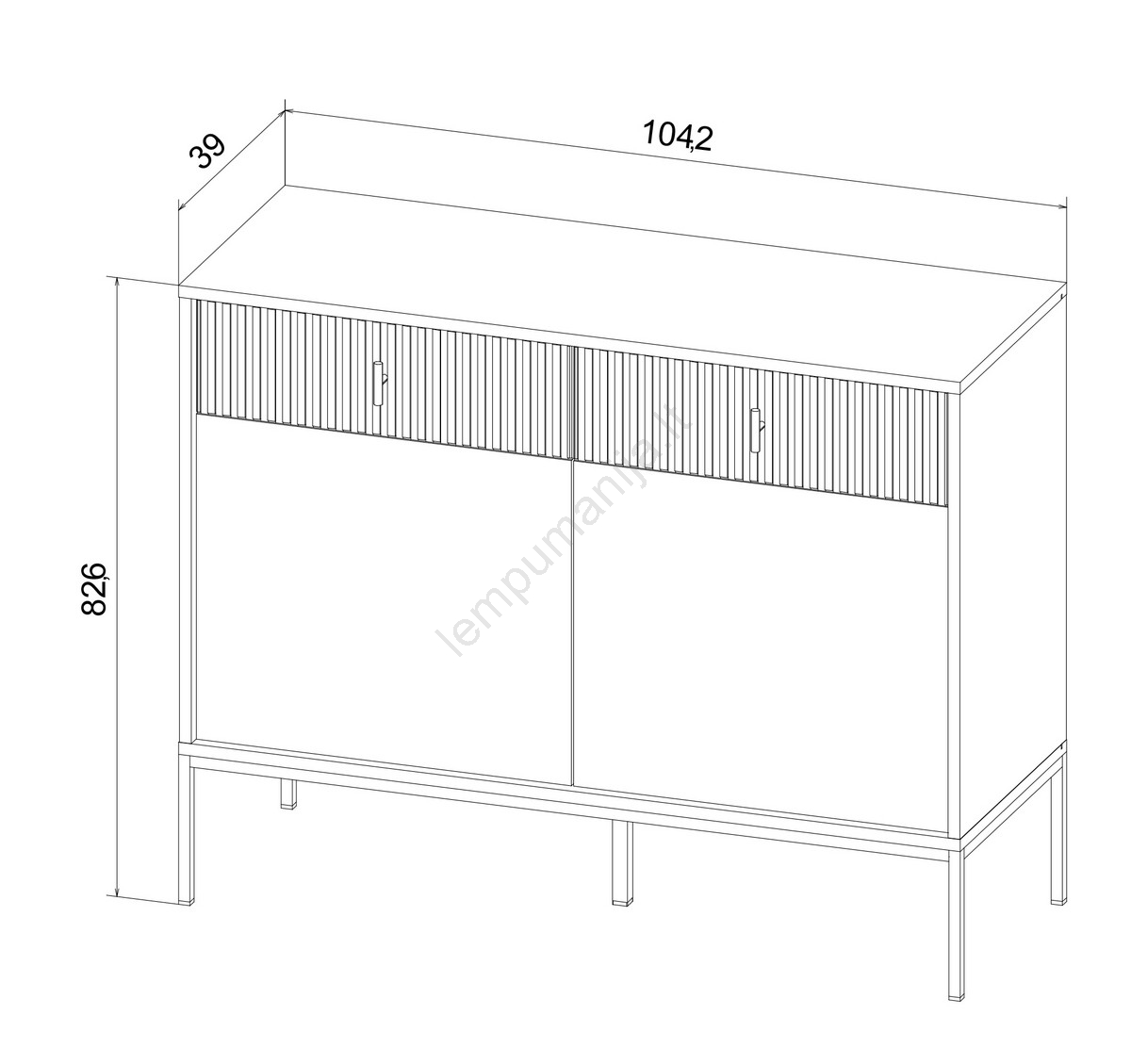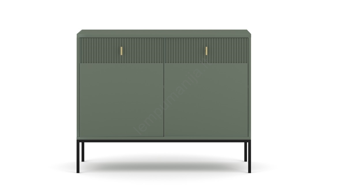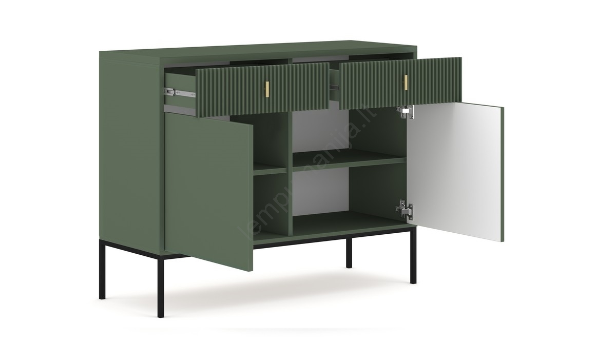 • Turi dvi apatinės dureles su erdvia vidine talpa ir du stalčius su rankenomis bei vertikaliu briaunojimu.