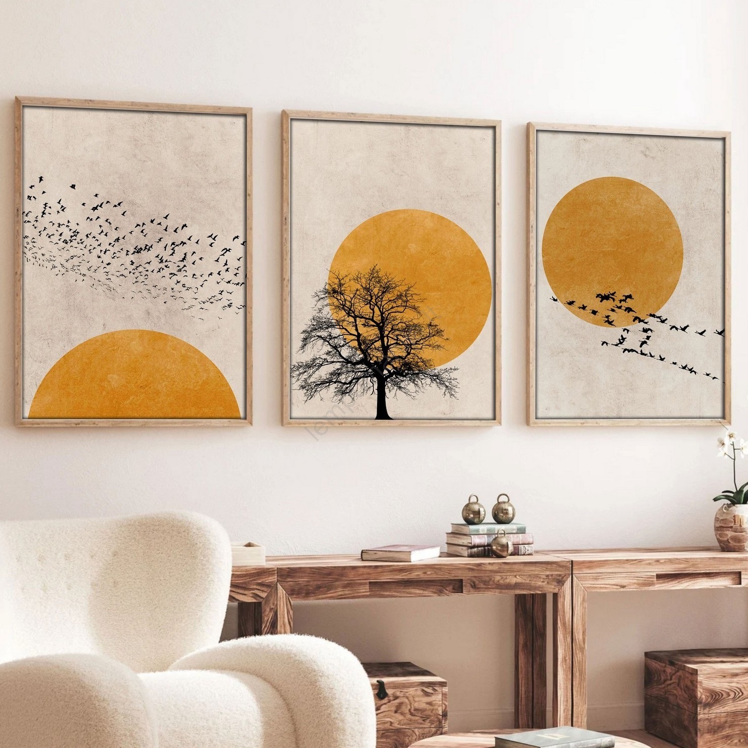 Komplektas 3 vnt. paveikslų rėmuose 50x70 cm smėlio/oranžinė | Lempumanija