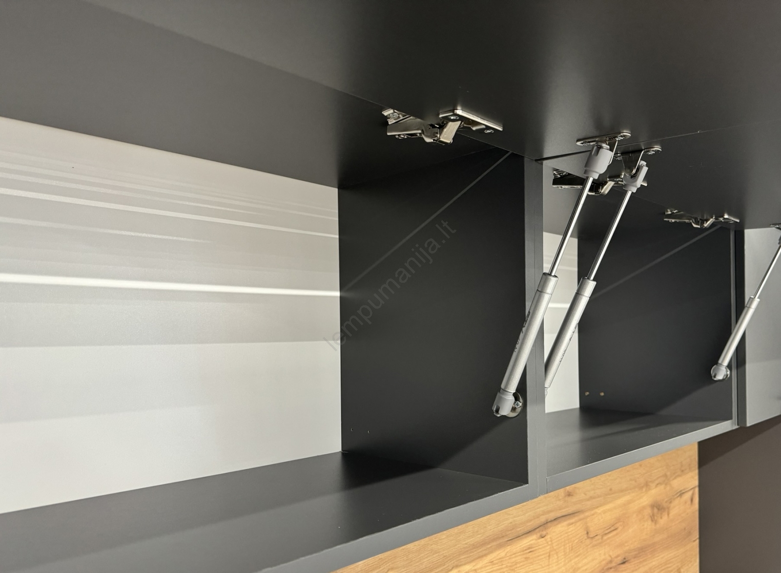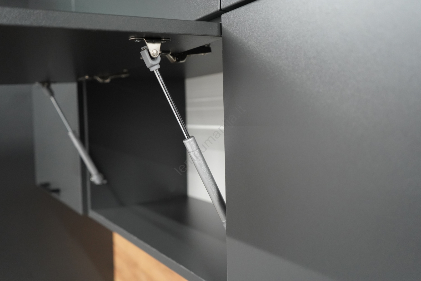 • Viršutinės spintelės yra aprūpintos dujiniais amortizatoriais, stalčiuose įmontuoti kokybiški apsaugoti metaliniai stalčių bėgeliai.