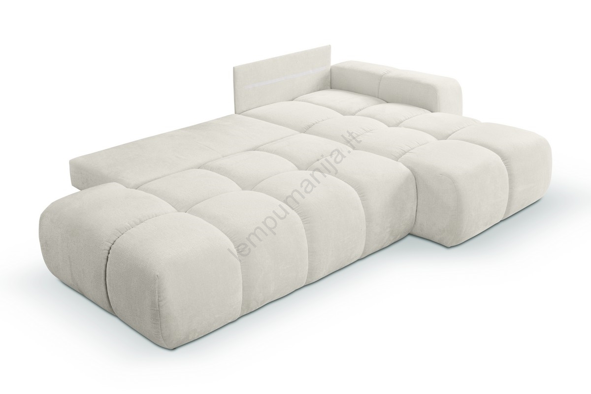 • Išskleidžiama dešinės pusės L formos apmušta kampinė sofa ALMADA, šviesiai smėlio spalvos, su talpia daiktų laikymo erdve