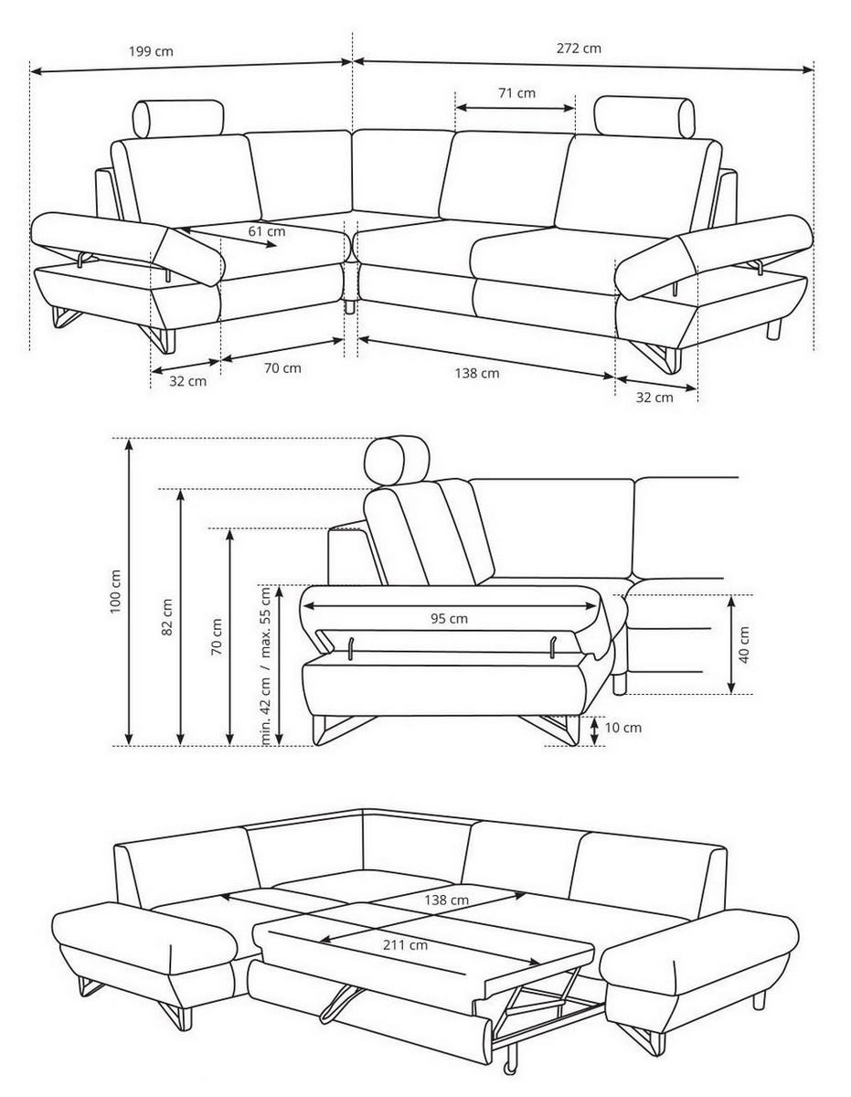 • Moderni išskleidžiama kampinė sėdimoji sofa AVESTA (dešinė pusė) yra puikus pasirinkimas tiems, kurie ieško stiliaus, patogumo ir praktiškumo derinio.