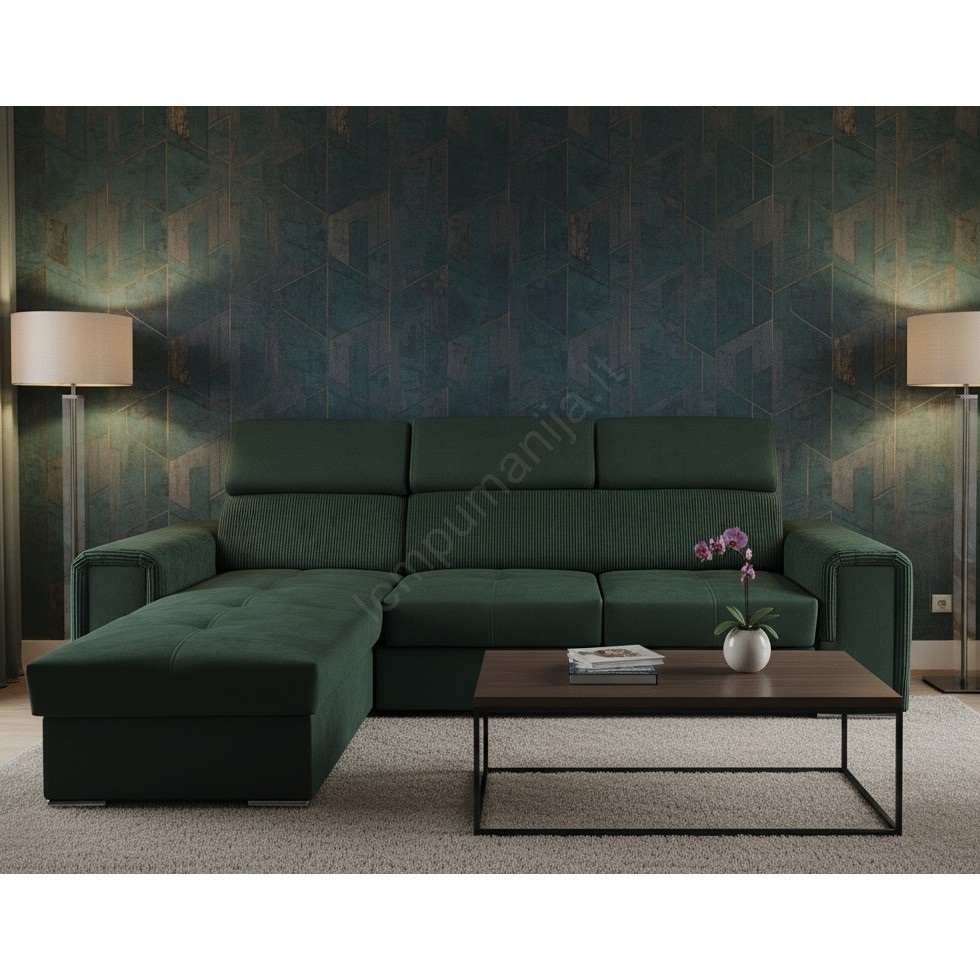 Universali L formos kampinė išskleidžiama sofa su patalynės dėže SALVADA žalia | Lempumanija
