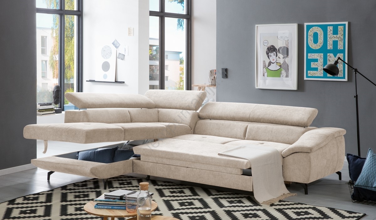 Išskleidžiama L formos kampinė sofa BRESCIA, kairinė, smėlio spalvos, su talpia daiktadėže