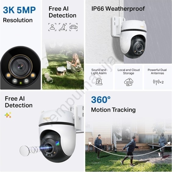 • Kamera veikia kaip lauko apsaugos Wi‑Fi kamera su pasukama galvute, suteikiančia plačią aprėptį ir išmaniuoju žmonių, gyvūnų bei transporto priemonių judesio aptikimu.