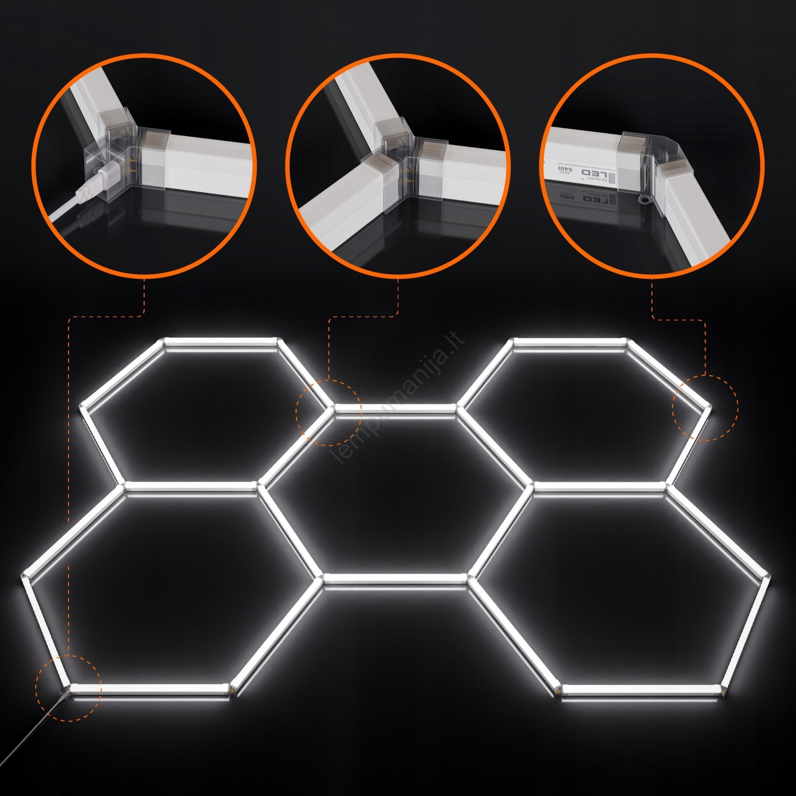 • Pakuotės turinys: maitinimo laidas (150 cm), 24 LED paneliai, 9 trigubos jungtys, 11 kampinės jungtys, 30 tvirtinimo kaiščių + varžtų, montavimo priedai (plastikiniai žiedai arba metalinės konsolės pagal pasirinkimą).