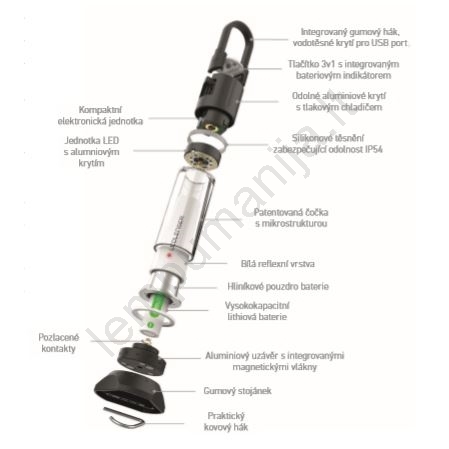 • Dėl fluorescencinių elementų žibintas lengvai matomas tamsoje; jį galima praktiškai bet kur pritaisyti ar pastatyti – pakabinti ant kablio, pritvirtinti integruotais magnetais arba pastatyti ant nuimamo stovelio.
