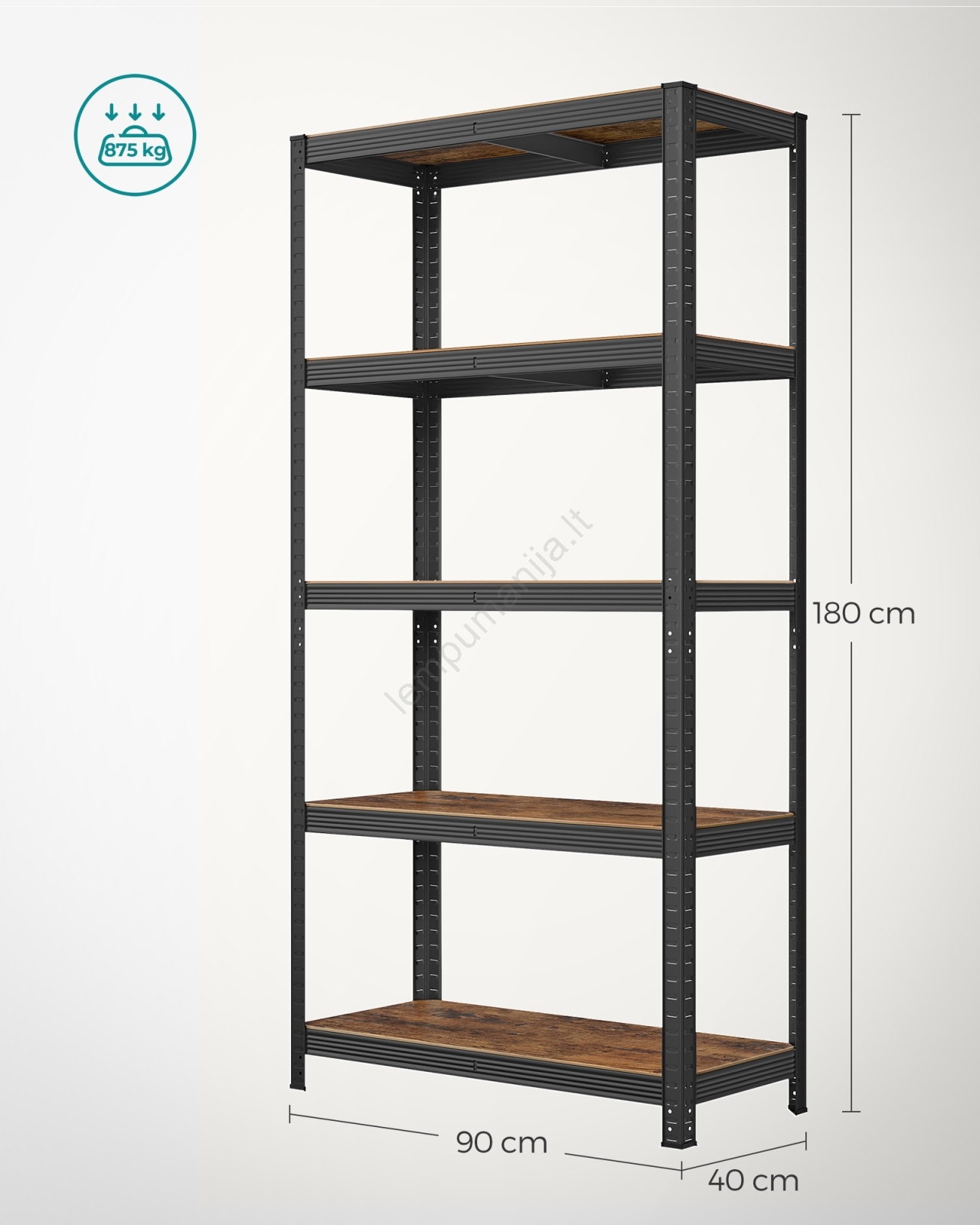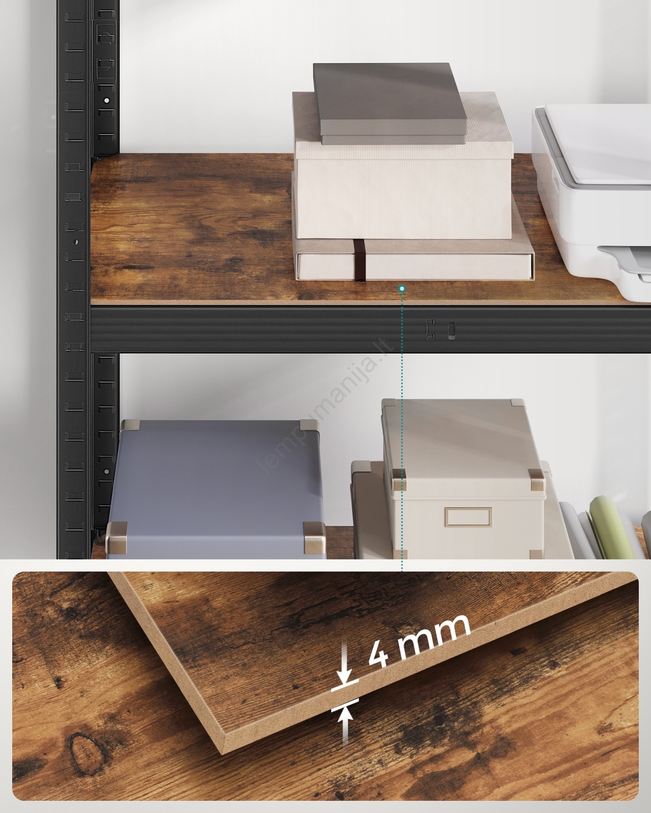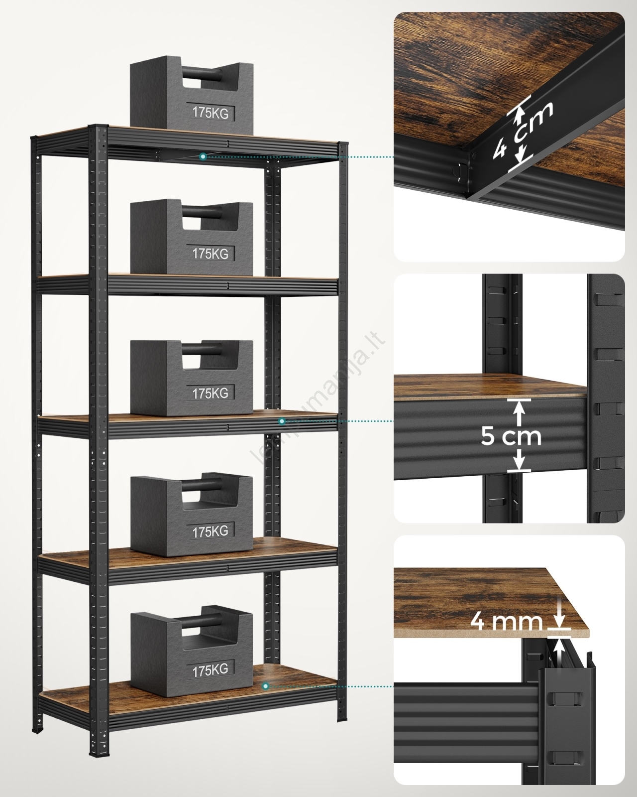 • Kiekviena lentyna atlaiko iki 175 kg ir saugiai talpina dažus, įrankius bei fitneso įrangą.