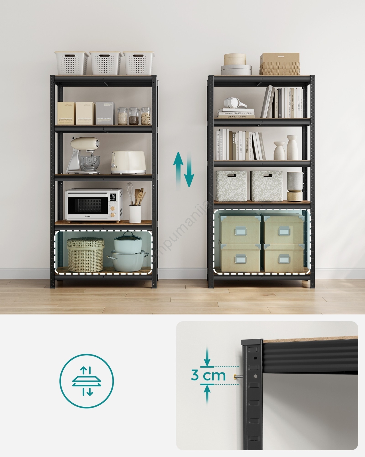 • Lentyną galima padalinti į dvi atskiras žemas lentynas, vieną galima naudoti virtuvėje kaip stovą orkaitėms ir mikrobangų krosnelei, kitą darbo kambaryje knygų, augalų, spausdintuvo ir kitų daiktų laikymui.