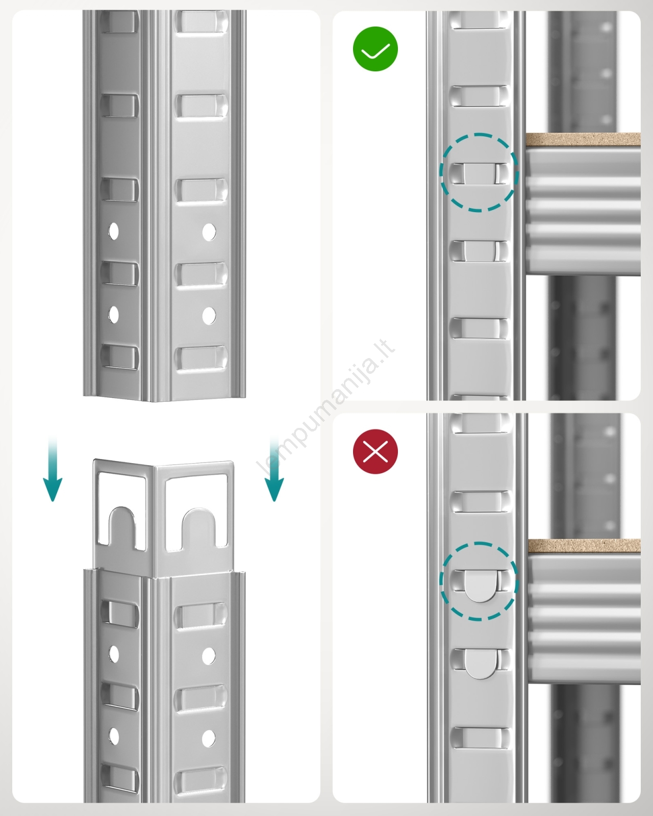 • Pakuotėje yra priešapvirstymo rinkinys, kuris padės pritvirtinti lentyną prie sienos, kad stelažas būtų stabilesnis ir saugesnis.