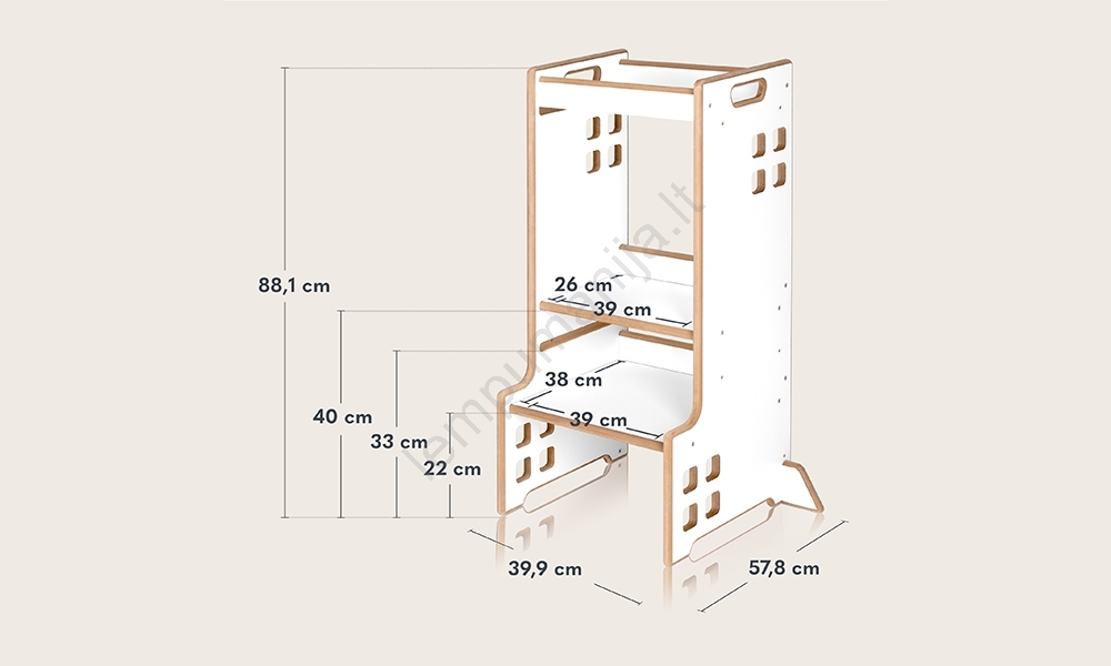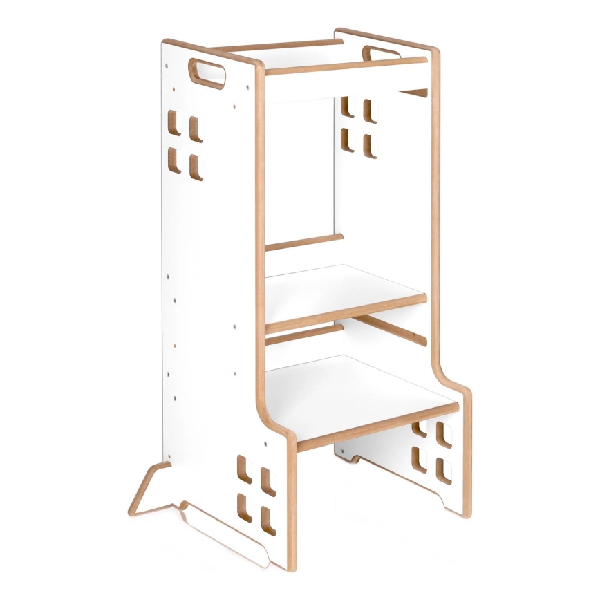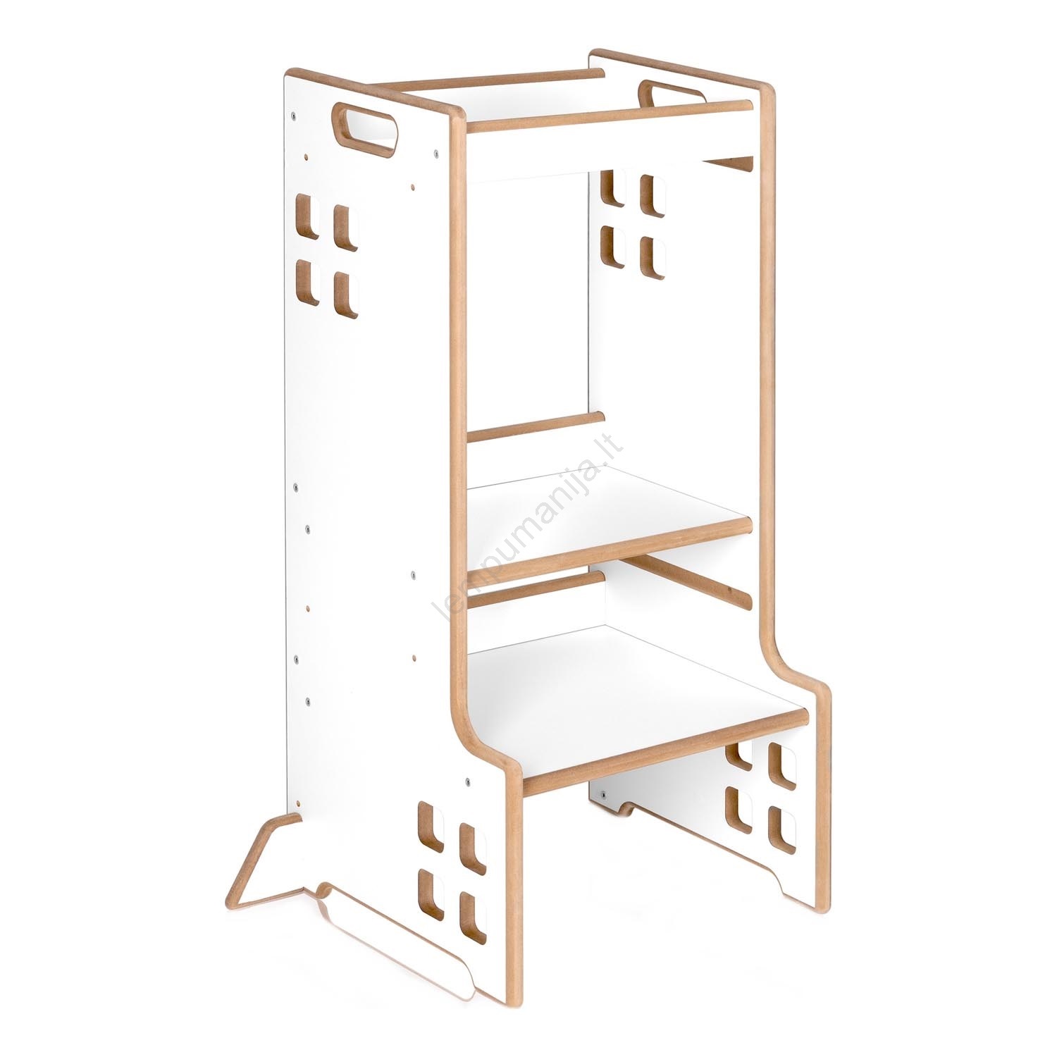 • Mokymosi bokštelis yra daugiafunkcinė kėdutė, leidžianti vaikams įsitraukti į įvairias kūrybines veiklas prie virtuvės stalviršio ar darbo stalo.
