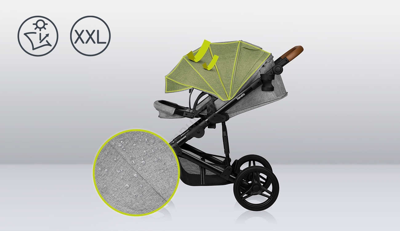 • Storas čiužinukas su medvilniniu užvalkalu, XXL vandeniui atsparus stogelis su UPF50+ apsauga.