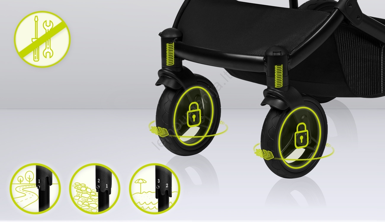 • Dideli, nereikalaujantys priežiūros off-road ratai (27 cm, plotis 5 cm) su giliu protektoriumi, sukamieji 360° su fiksavimo funkcija, centriniai amortizatoriai su 3 kietumo lygiais.