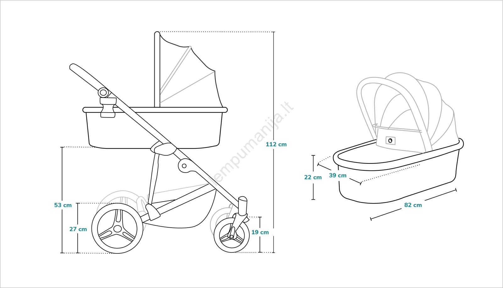• Vežimėlis 2 viename – lopšys ir sportinė dalis, tinkamas nuo gimimo iki maždaug 4 metų (lopšys iki 9 kg, sportinė dalis iki 22 kg).