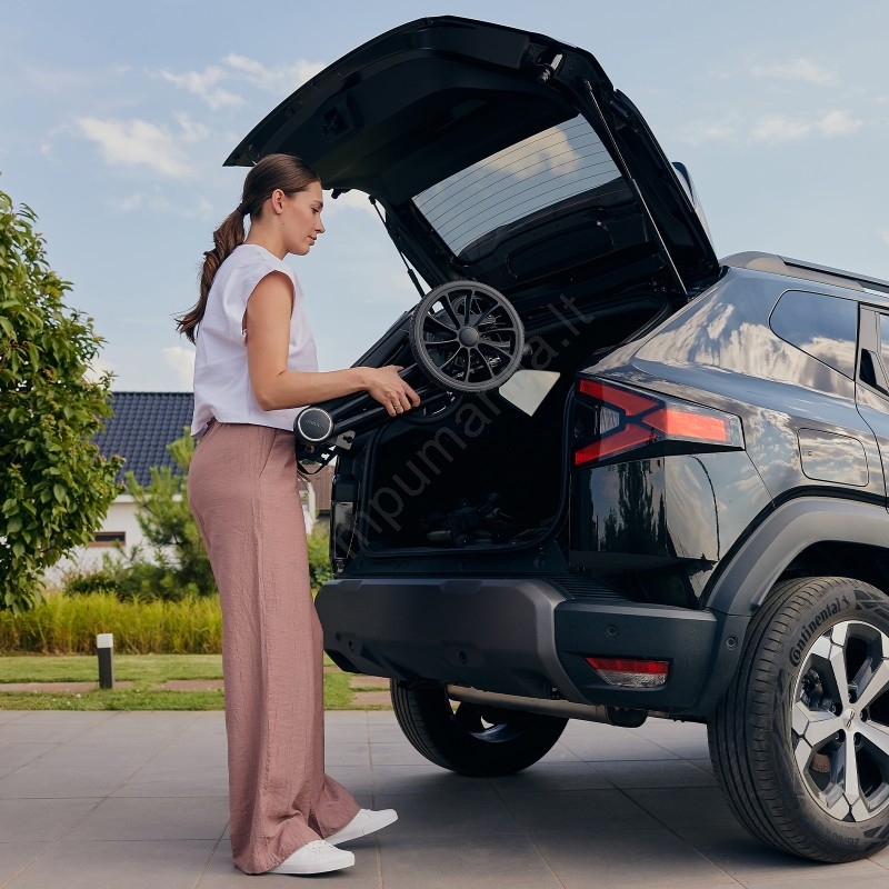 • Žemas svorio centras lengvam manevravimui, dviejų pakopų sulankstymas kartu su sėdyne, nešiojimo dirželis.