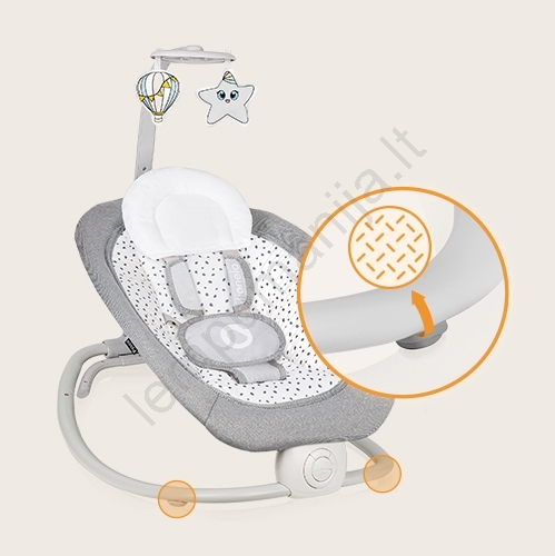 • Sūpuoklė turi nuimamą žaislų juostą su kabančiu žaisliuku, kuris linksmins žaidimų metu.