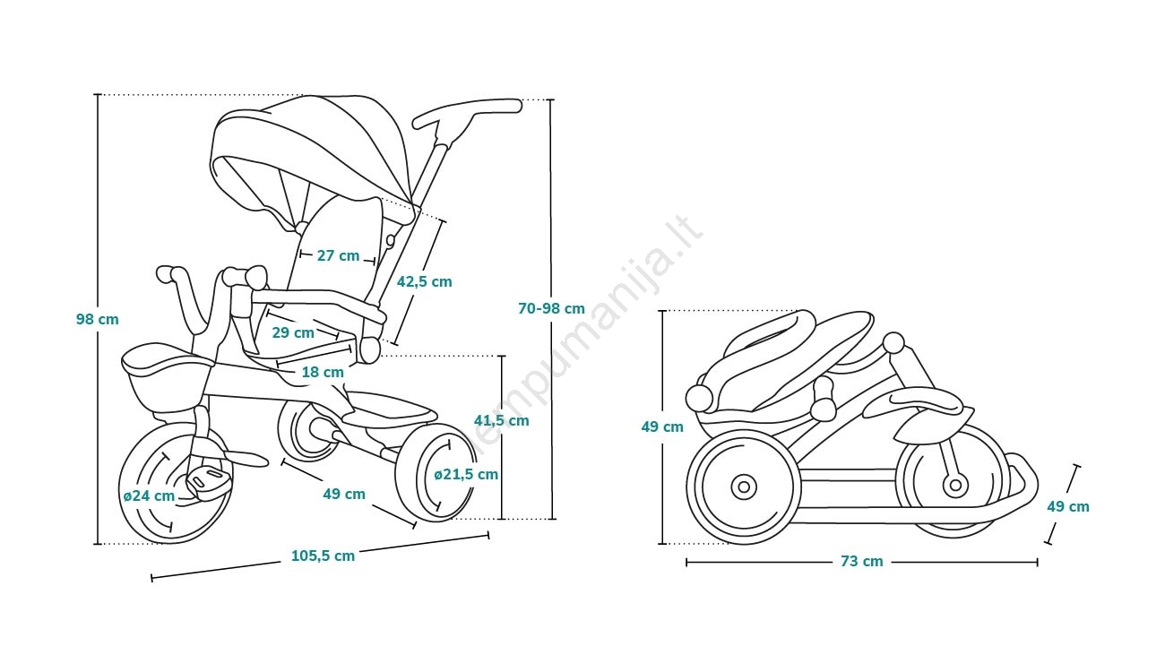 • Vairavimo rankenos aukštį (70 - 99 cm) galite pritaikyti vaiko ūgiui.
