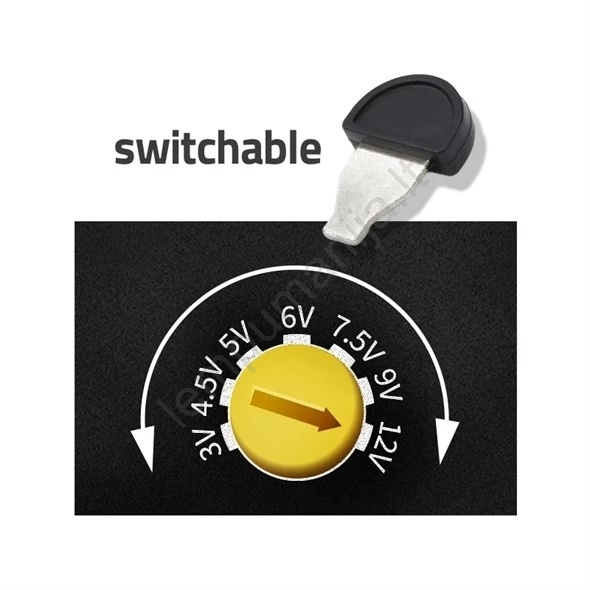 • Dėl pasukamo išėjimo įtampos jungiklio galima lengvai nustatyti reikiamą vertę nuo 3 iki 12 V DC, užtikrinant suderinamumą su įvairiais įrenginiais.