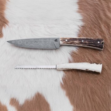 Damasko medžioklinis peilis su mini pjūklu 11 cm elnio ragas