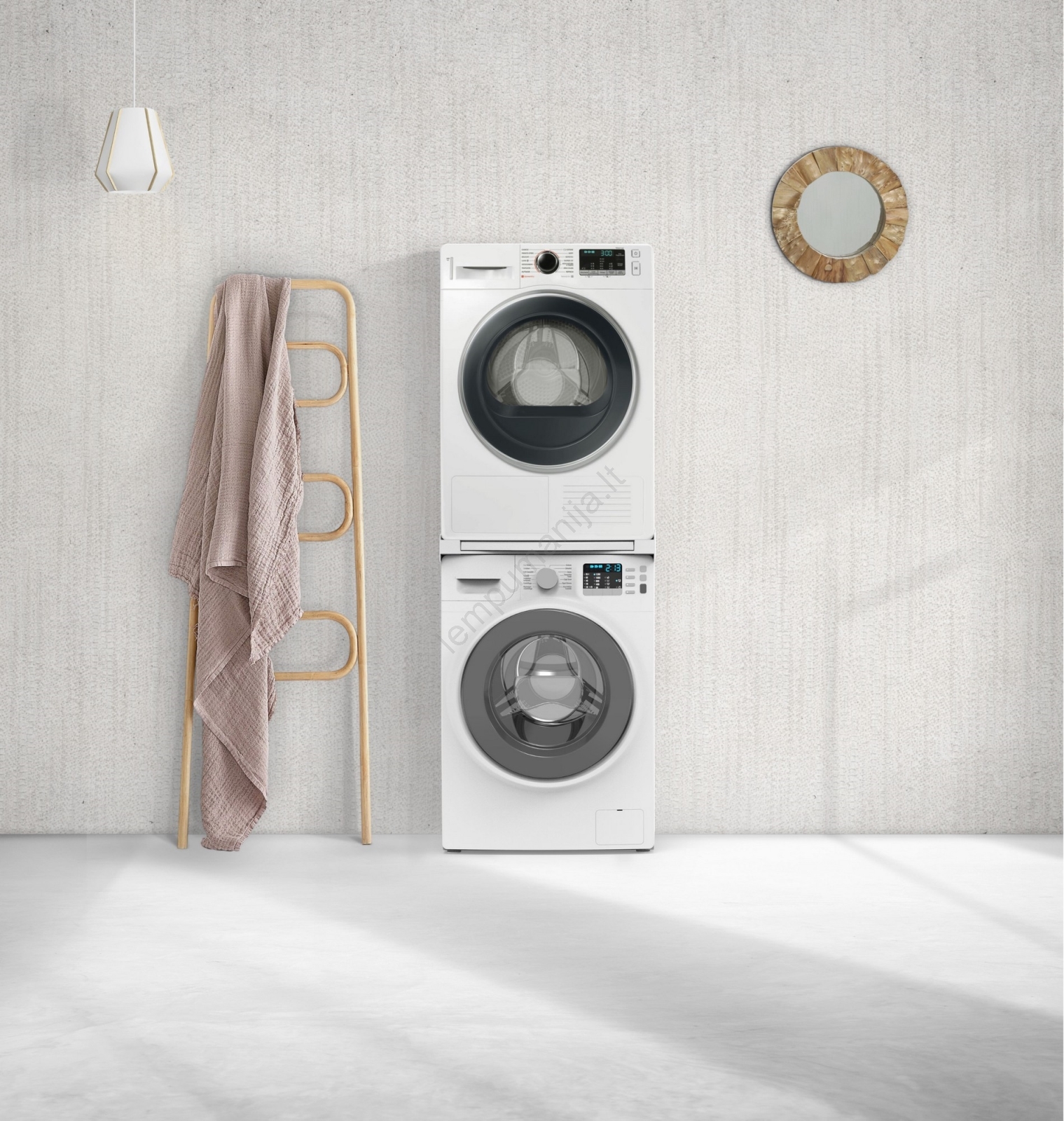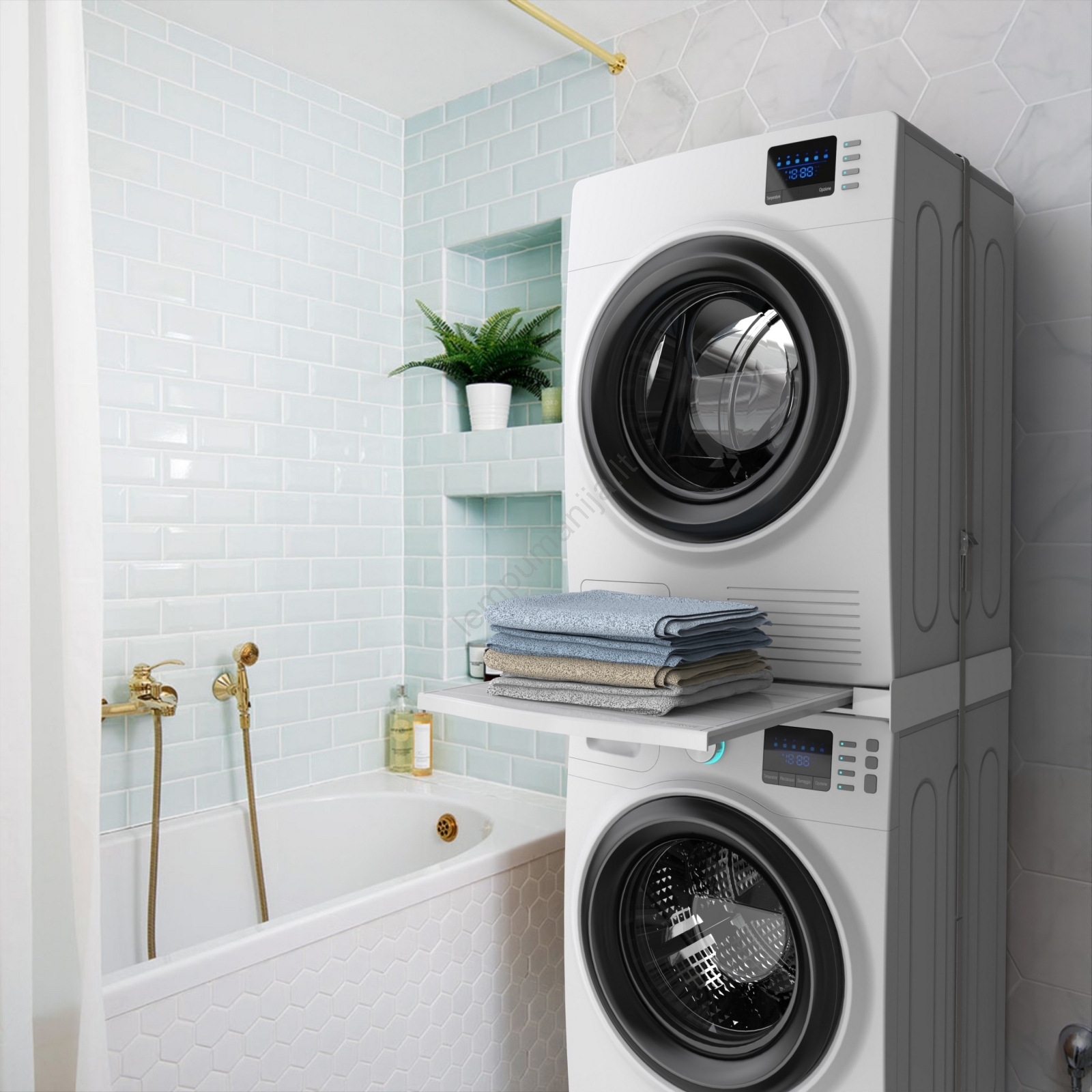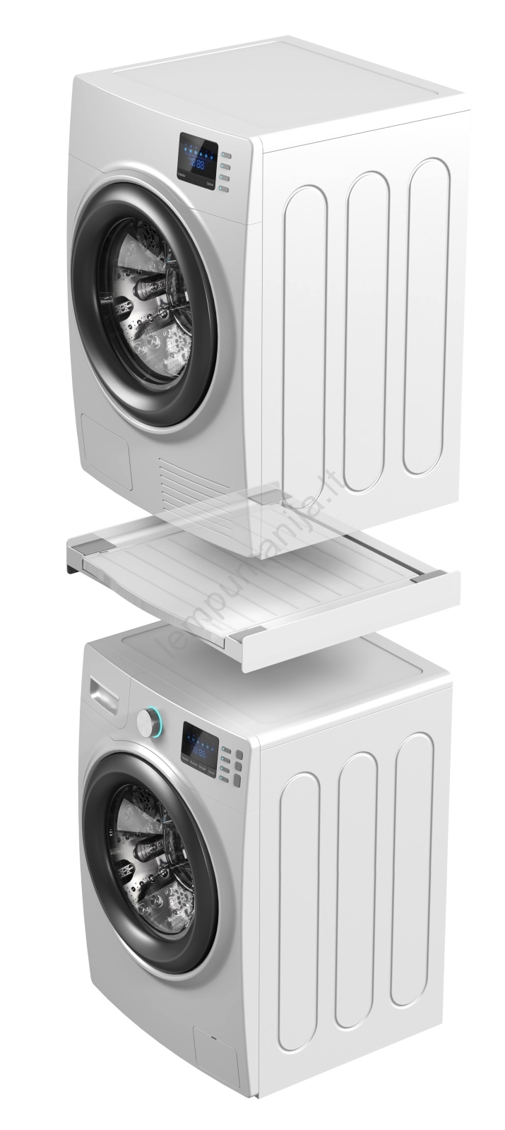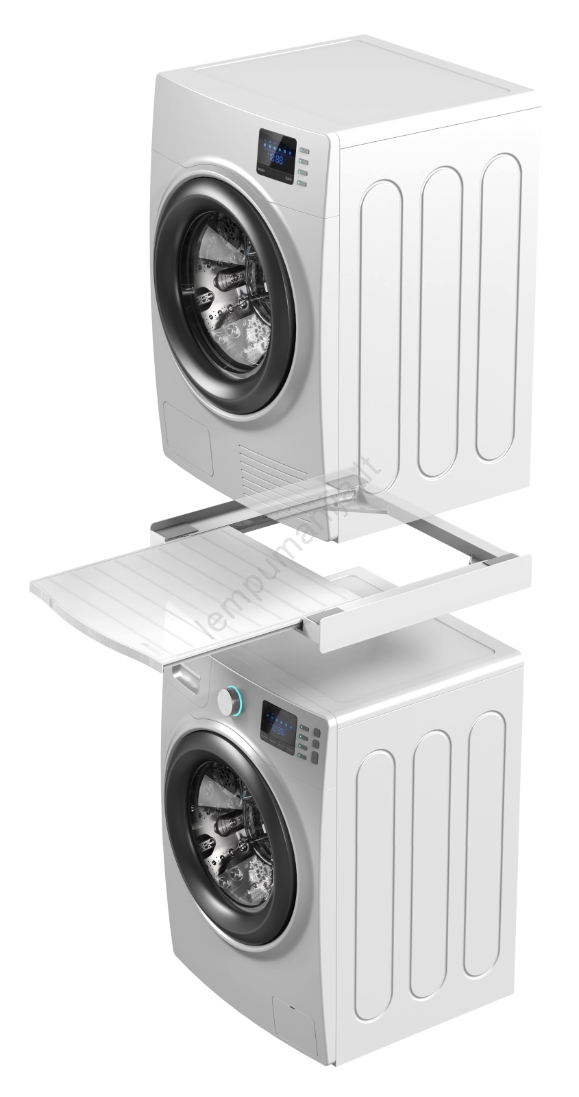 • Universalus jungiamasis rinkinys skalbimo mašinoms (gylis 45–60 cm) ir priekinio įkrovimo džiovyklėms.