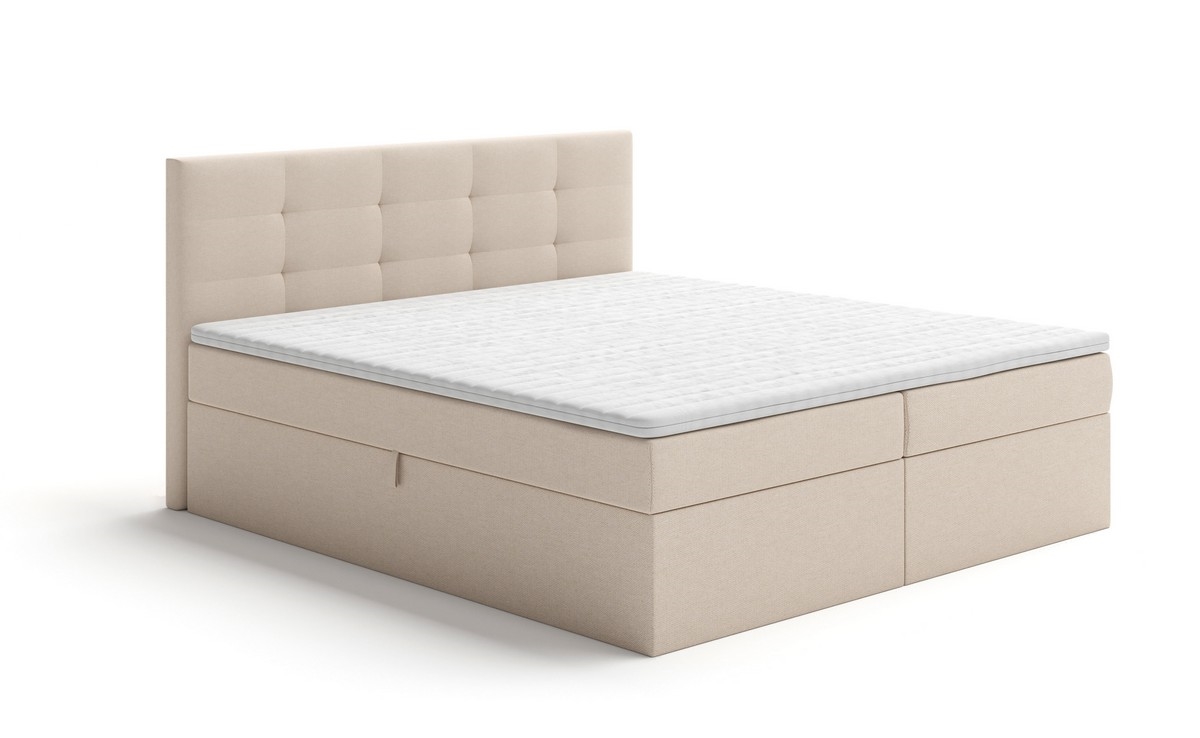 • Apmušta lova EMBER 160x200 cm su čiužiniais, topperiu ir talpia patalynės dėže, smėlinė