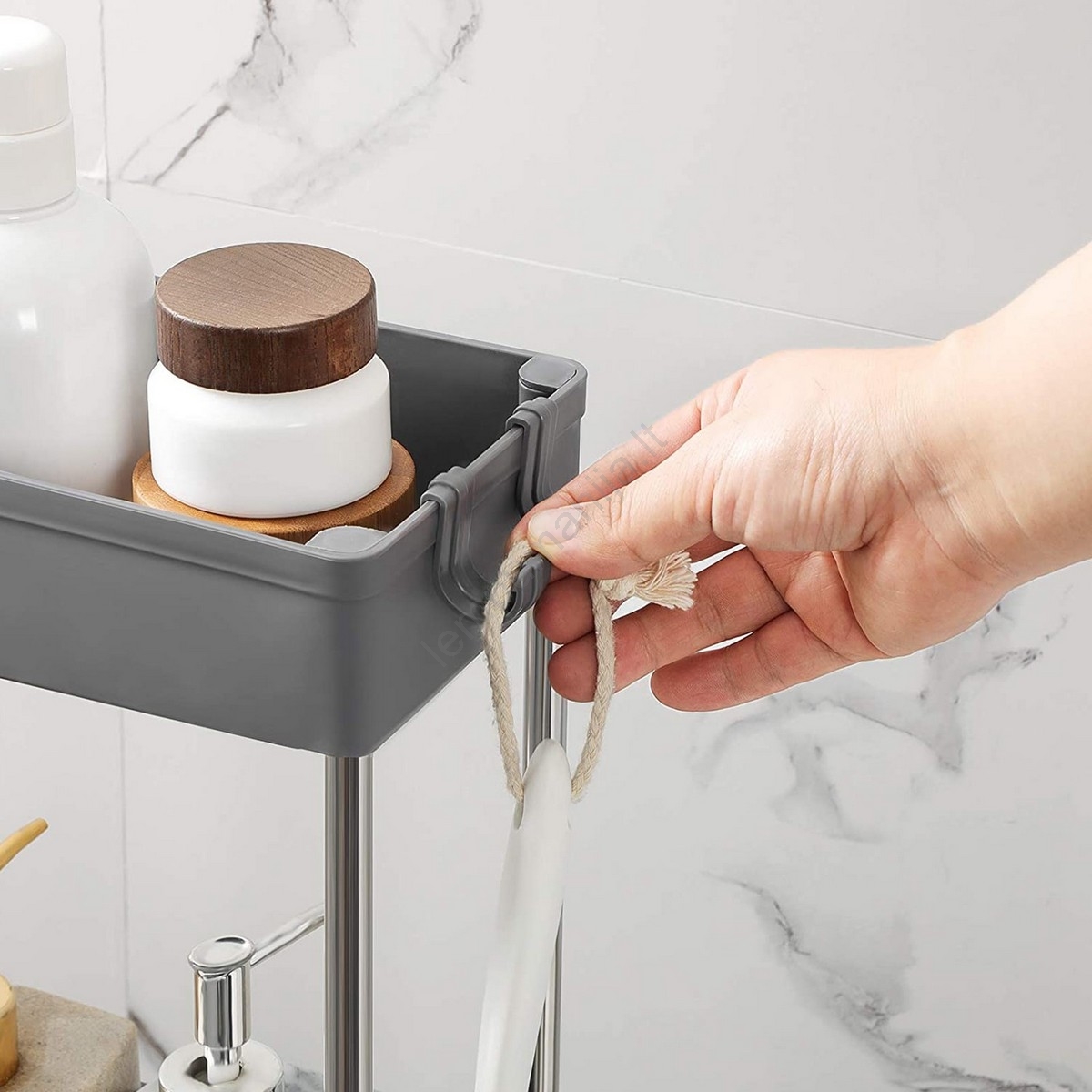 • Dėl keturių sklandžiai pasukamų ratukų galite vežimėlį perstumdyti bet kur, kur reikia, taip išnaudodami kampą prieskonių buteliukams ar vonios reikmenims susitvarkyti.
