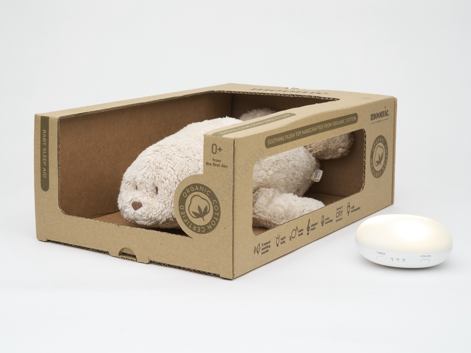 • Moonie - minkštas migdomasis žaislas su raminančia melodija ir švelniu apšvietimu, ruonis organic polar