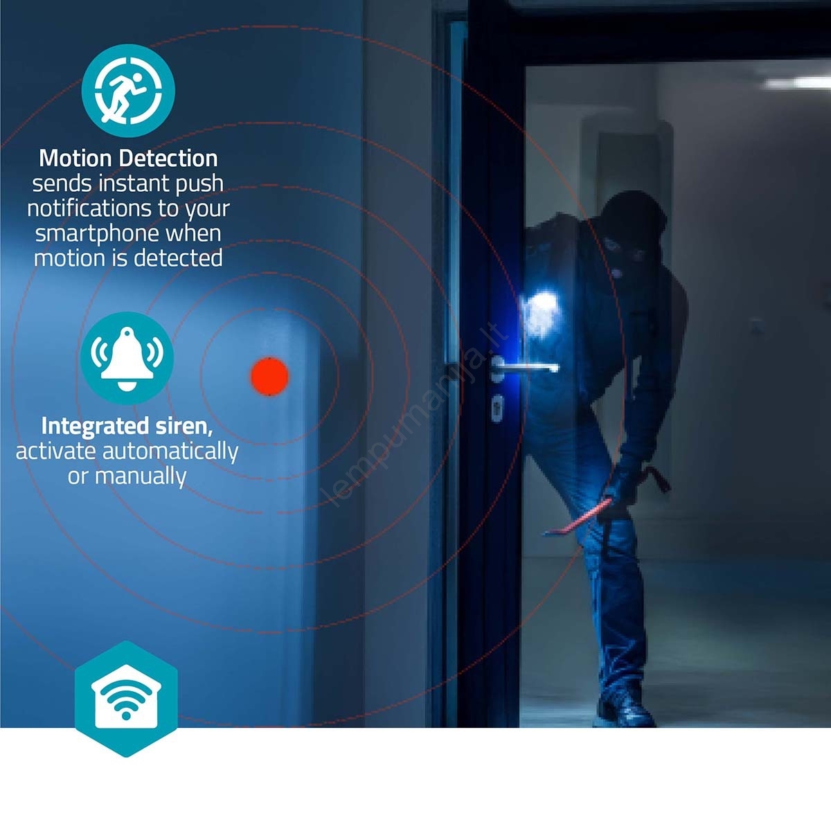 • Sirenos aktyvavimas aptikus judesį, siekiant atbaidyti įsibrovėlius.