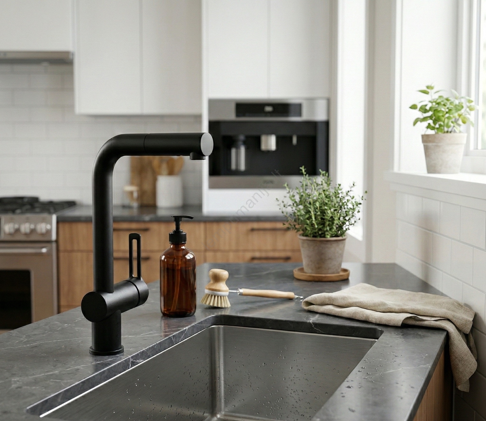 • Modernus virtuvinis kriauklės maišytuvas elegantiškos matinės juodos spalvos.