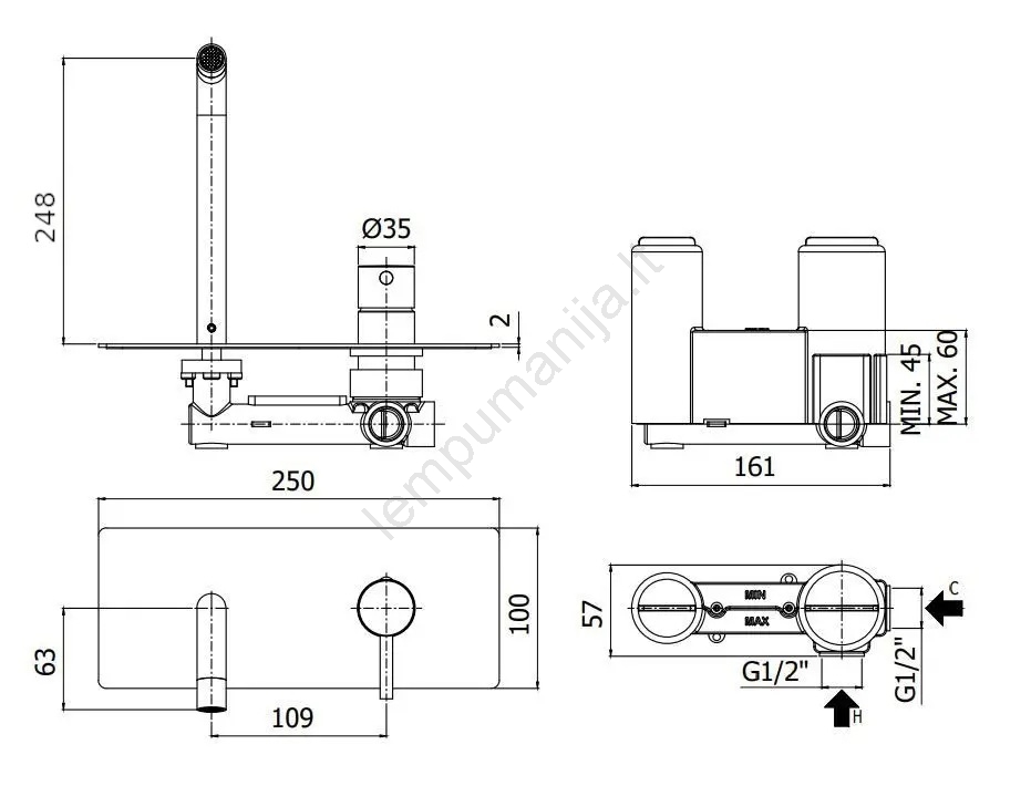 • Į sieną montuojamas praustuvo maišytuvas su švariu, minimalistiniu dizainu.