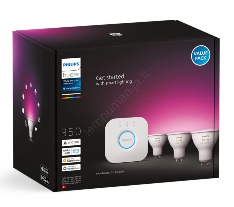 • Rinkinį sudaro Hue Bridge tiltas ir 3 LED RGB lemputės Philips Hue White And Color Ambience su GU10 lizdu.