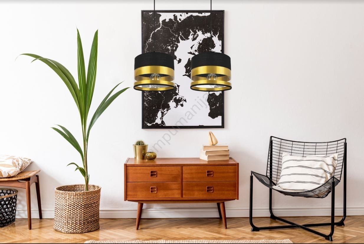 Pakabinamas sietynas MILO 2xE27/60W/230V auksas/juodas pasižymi gražiu ir funkcionaliu dizainu.  Šviestuvui tinka lemputė su E27 dangteliu. Čia galite įsigyti kitų lempučių palankiomis kainomis. Įdomus jūsų namų priedas.