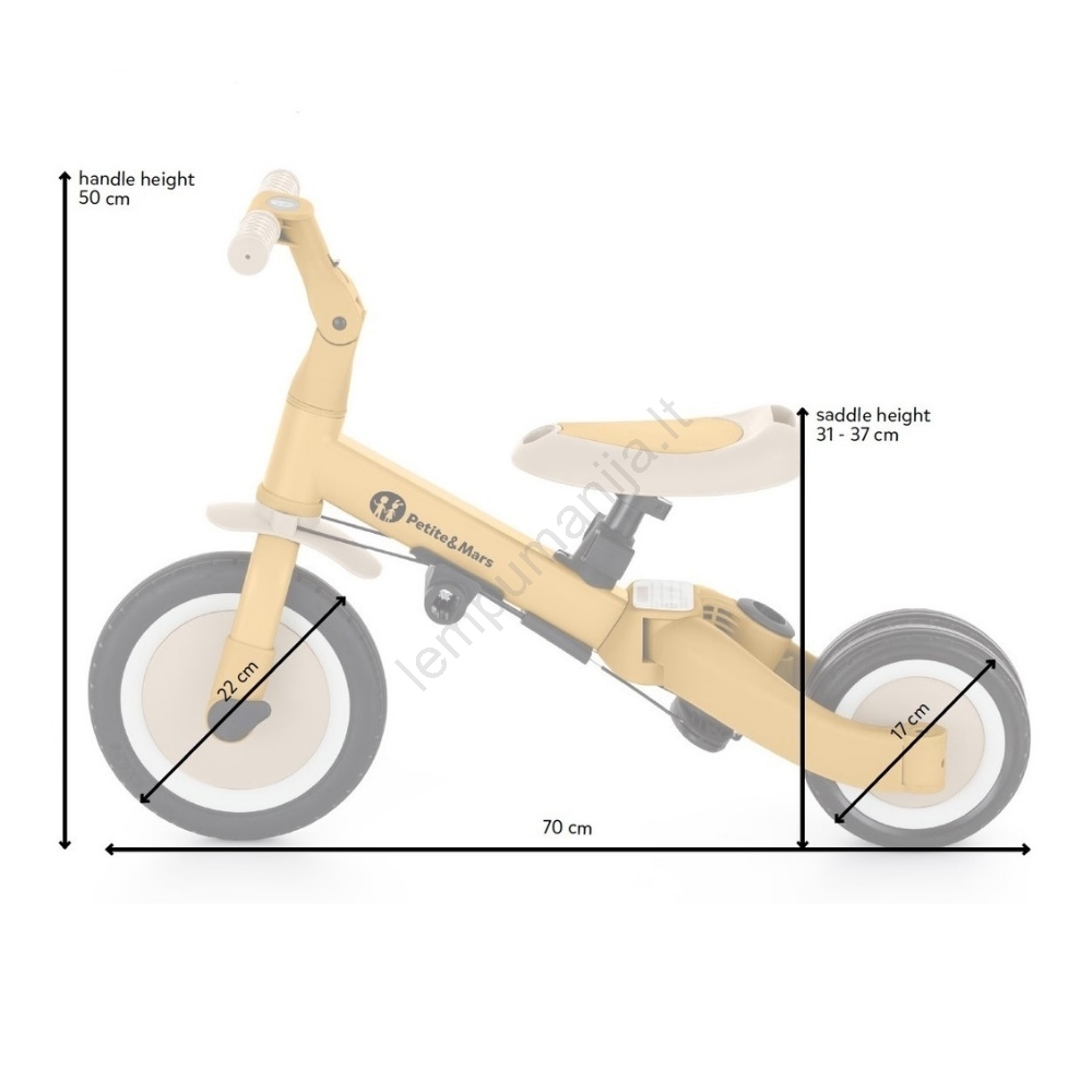 • Vaikiškas triratukas 5 viename: su tėvų valdymu, skirtas savarankiškam judėjimui, triratukas su pedalais, balansinis riedamasis dviratukas ir dviratis su pedalais.