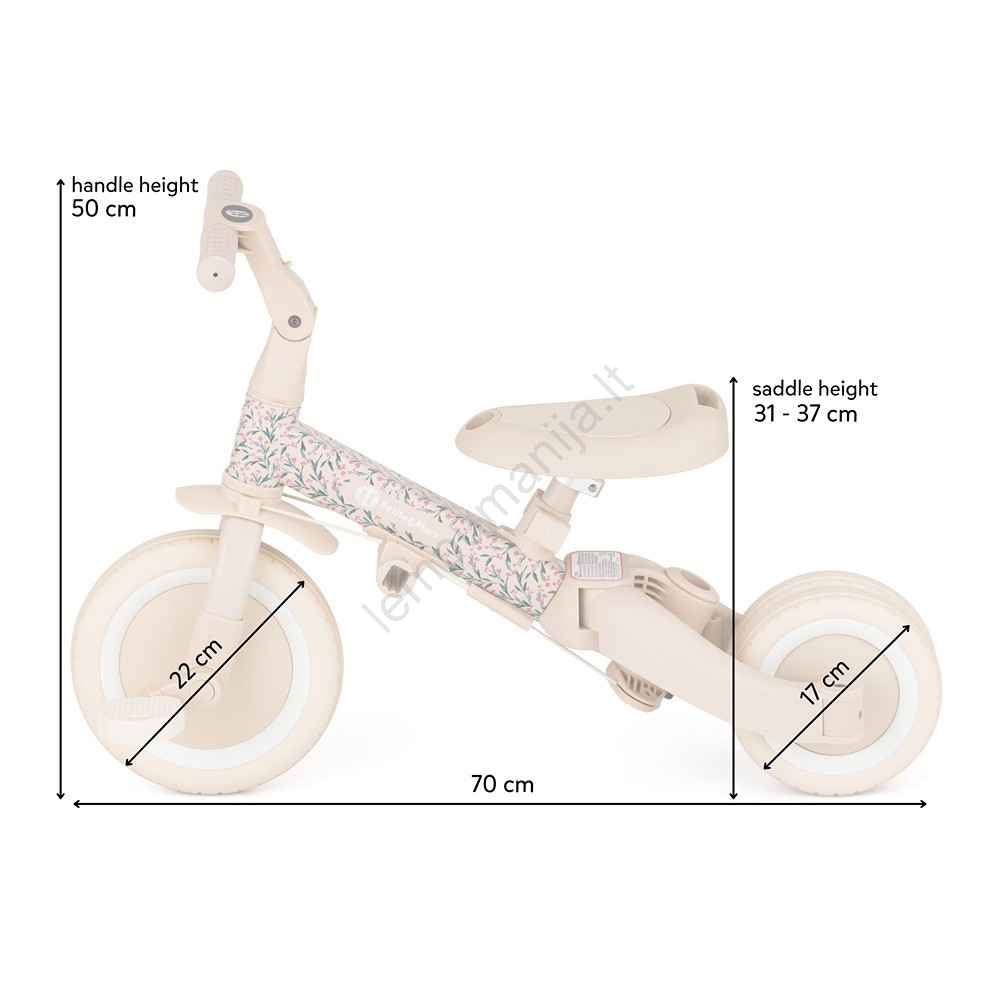 • Matmenys triratės versijoje: ilgis: 67 cm, plotis: 46 cm, aukštis (sėdynė): 31–37 cm.