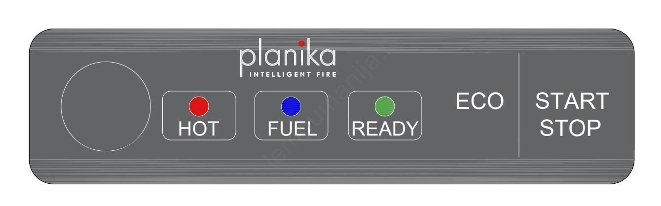 • Kontrolės pultas leidžia rankiniu būdu įjungti ir išjungti židinį, perjungti į ECO režimą ir tuo pačiu signalizuoja, kada kuro bakas tuščias, kada židinys paruoštas įjungti ir kada jis perkaista.