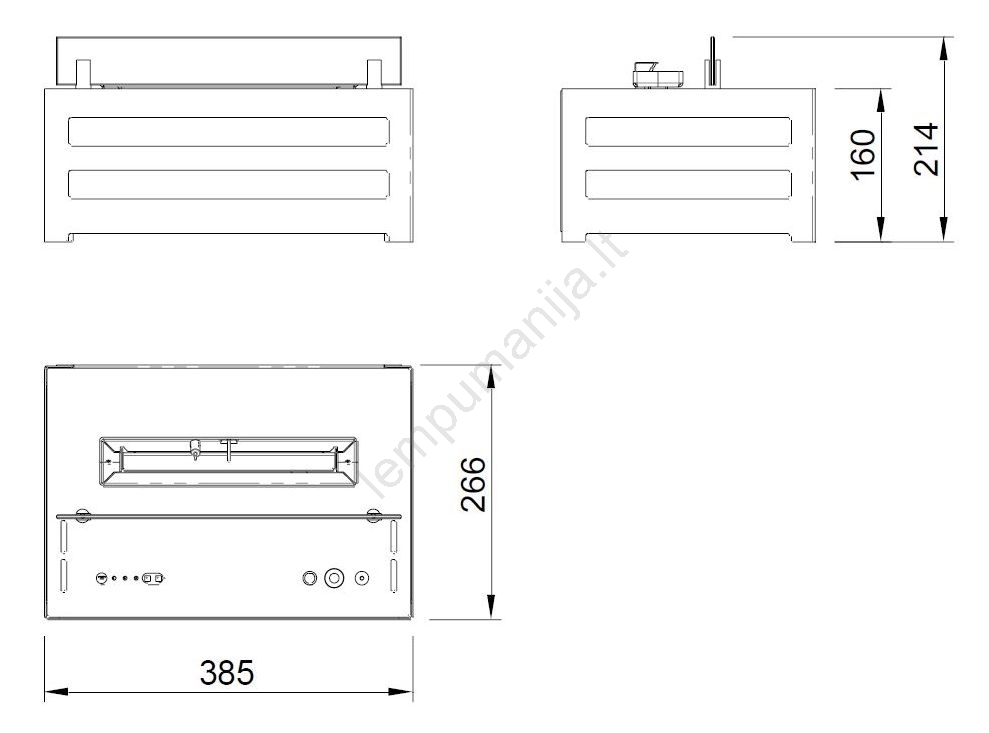 • Kontrolės pultas leidžia rankiniu būdu įjungti ir išjungti židinį, perjungti į ECO režimą ir tuo pačiu signalizuoja, kada kuro bakas tuščias, kada židinys paruoštas įjungti ir kada jis perkaista.
