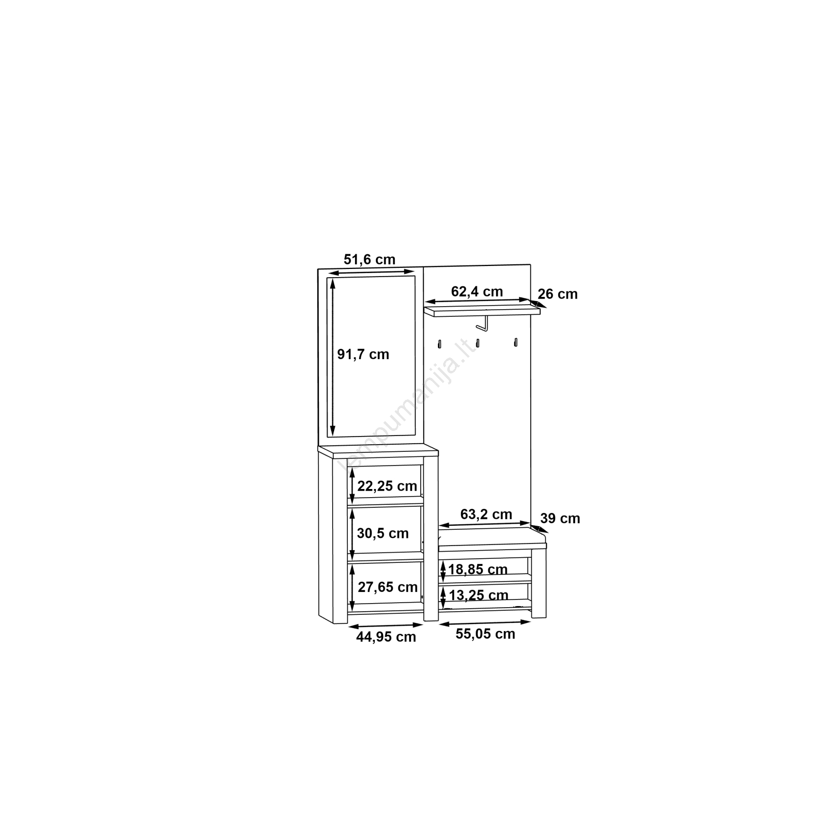 • Po viršutine plokšte yra keletas uždarų skyrelių ir batų lentynų, skirtų aksesuarams ar kitoms kasdienėms smulkmenoms.