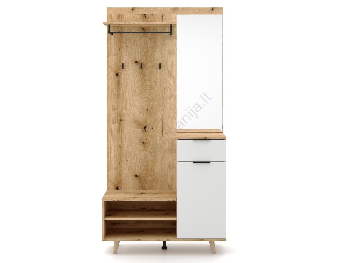 • Po jos yra keletas uždarų skyrelių ir atviros lentynos batams, aksesuarams ar kitiems kasdieniams daiktams.