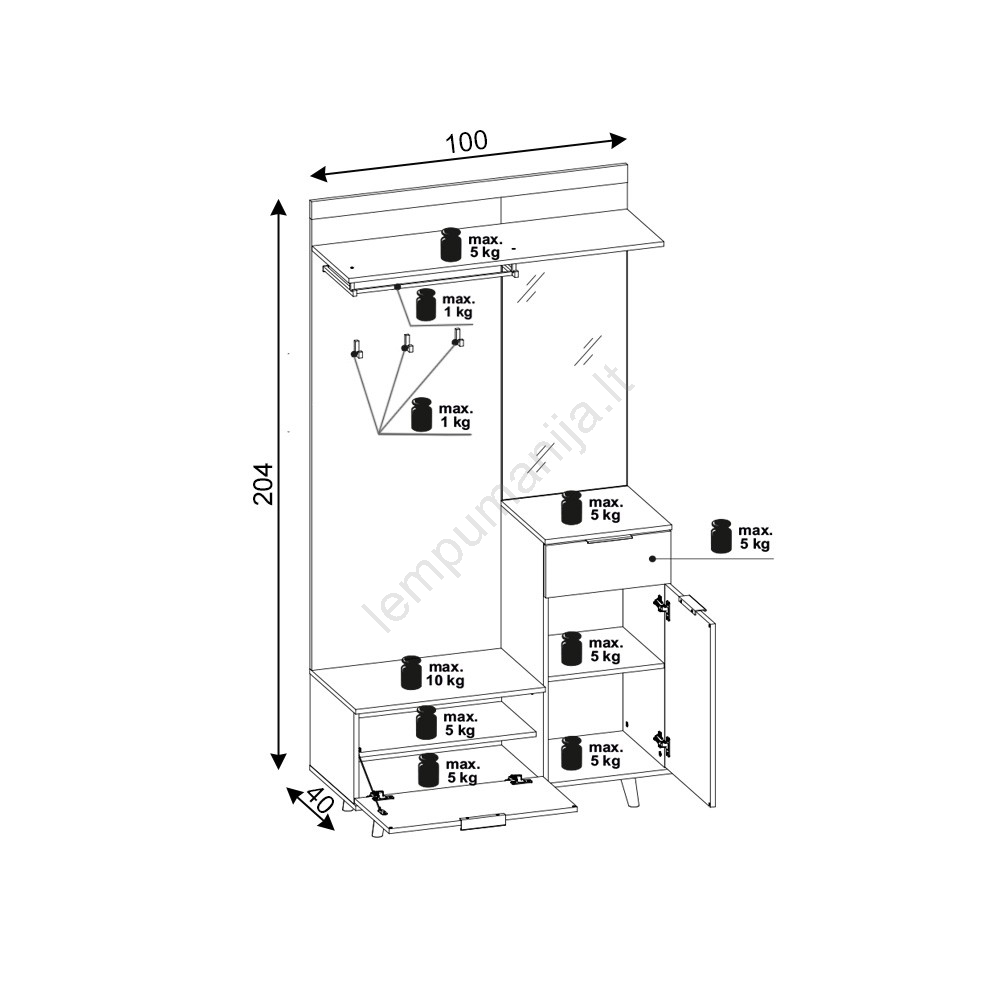 • Lentynos, kabliukai, drabužių strypas ir didelis veidrodis suteikia būtent tai, ko jums reikia.