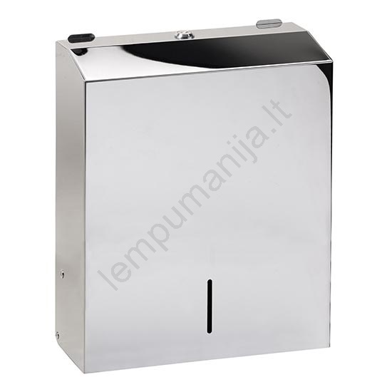 • Modernus nerūdijančio plieno popierinių rankšluosčių dozatorius su blizgiu paviršiumi.