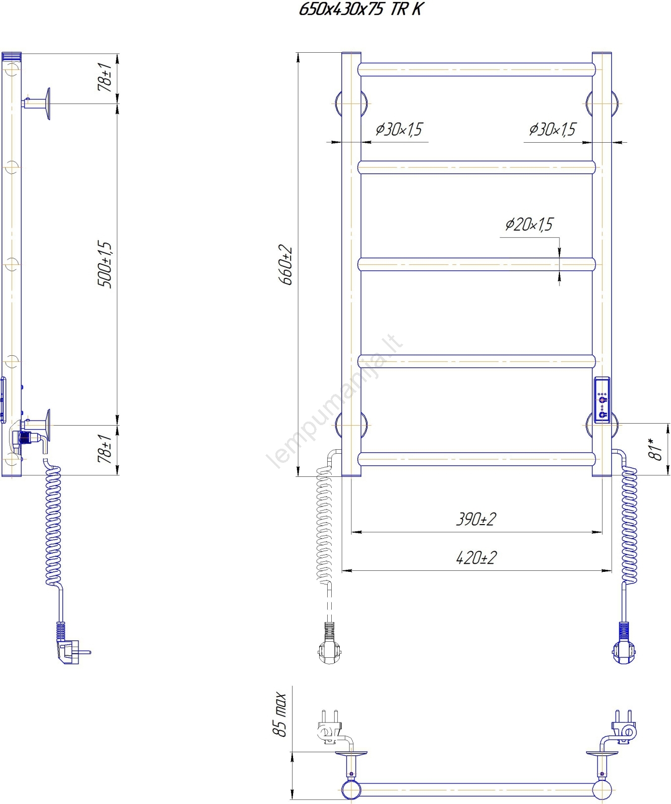 Vonios rankšluosčių radiatorius CLASSIC 65W/230V 66x42 cm, nerūdijančio plieno/balta, dešininis