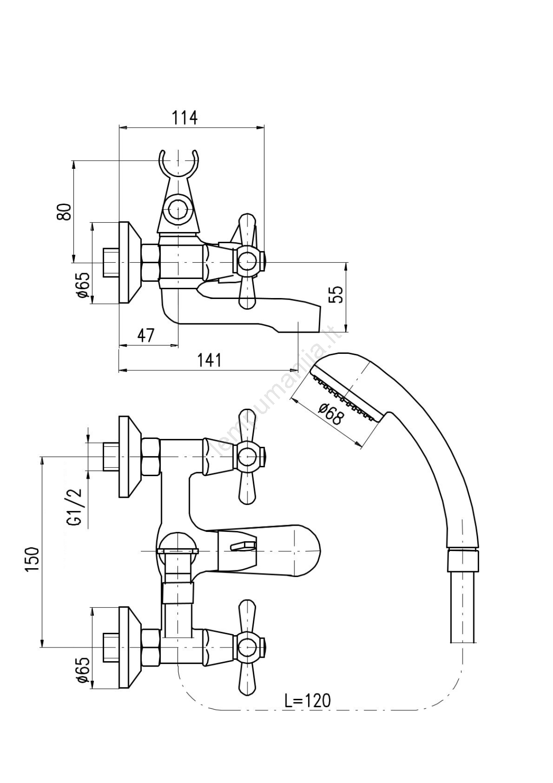 • Vonios komplektas su sieniniu vonios maišytuvu su keraminiu perjungikliu, dušo laikikliu ir rankiniu dušu.