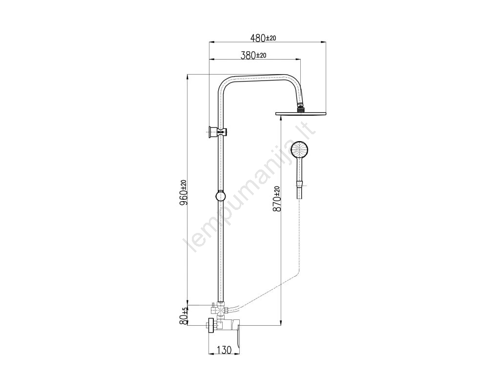 • Komplektą sudaro: dušo maišytuvas, plastikinė rankinė dušo galvutė (skersmuo 103 mm), plastikinė viršutinė dušo galvutė (skersmuo 230 mm), plastikinė dušo žarna (1500 mm), dušo stovas.