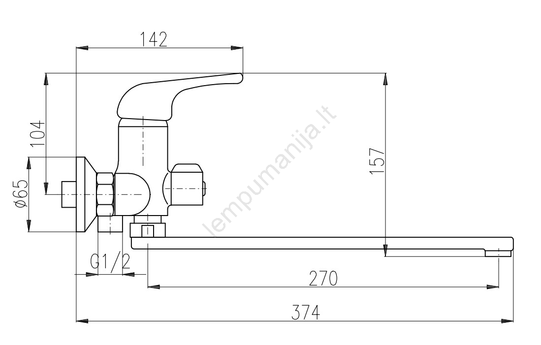 • Sieninis maišytuvas voniai ir praustuvui su plokščiu, pasukamu čiaupo snapu.