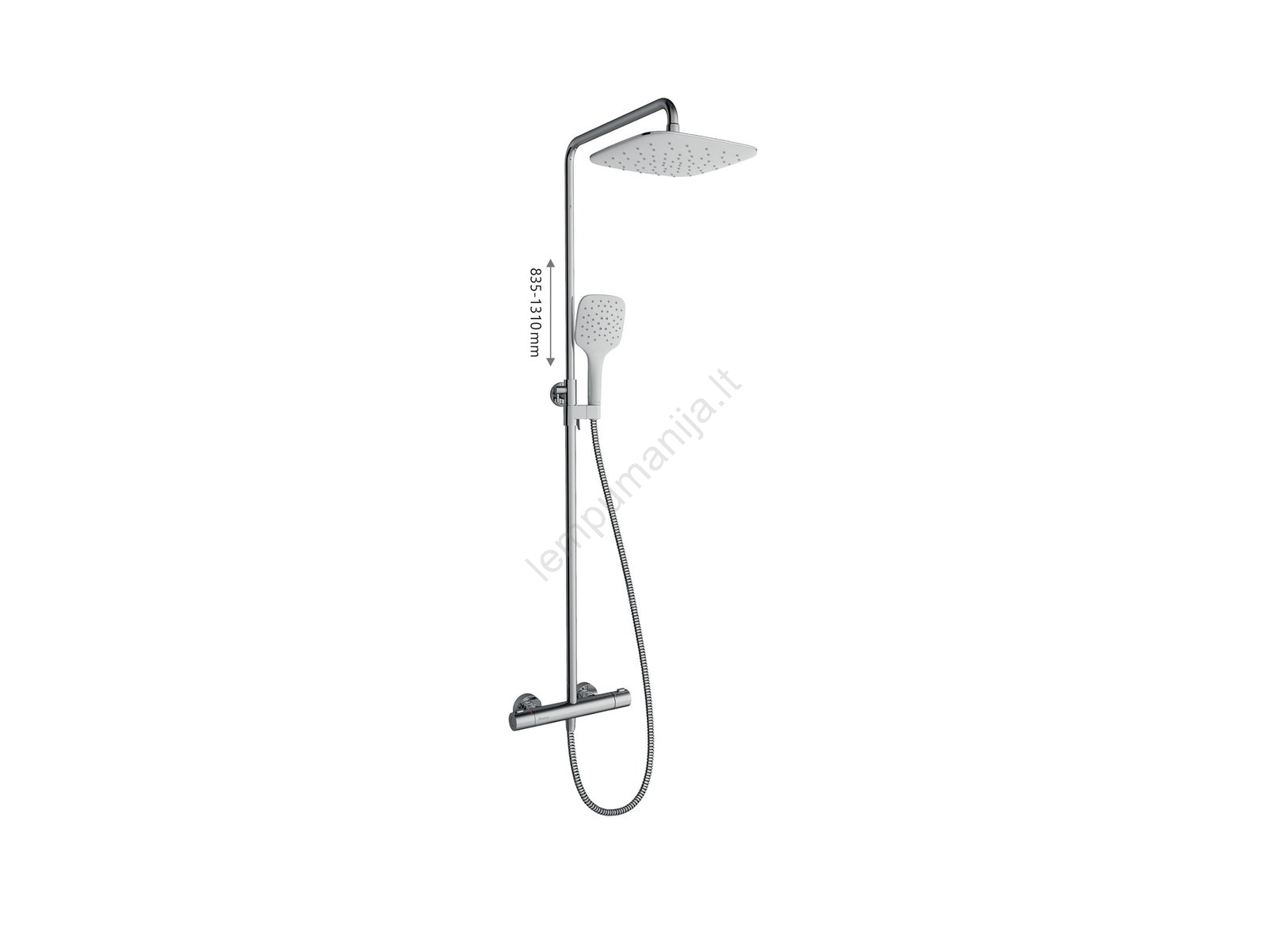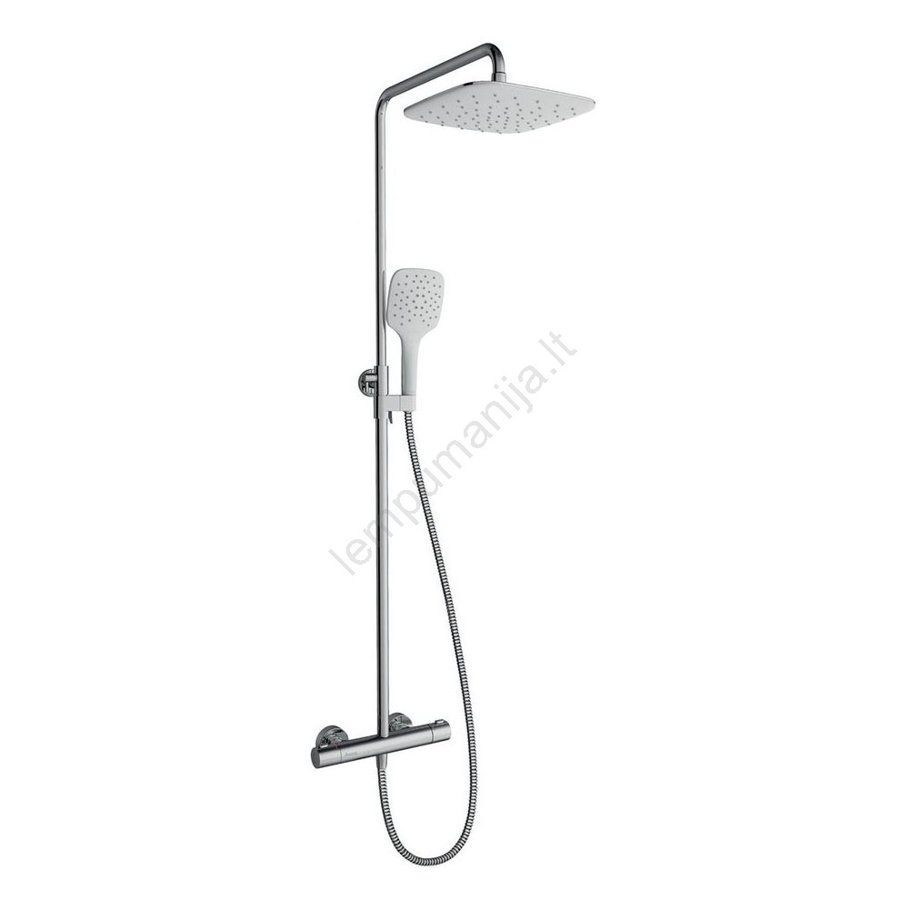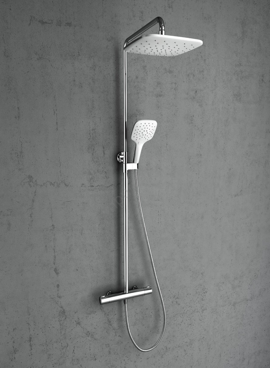 • Termo dušo stulpas yra slankiojantis komplektas su termostatiniu maišytuvu, blizgaus chromo apdaila ir balta viršutine dušo galvute.