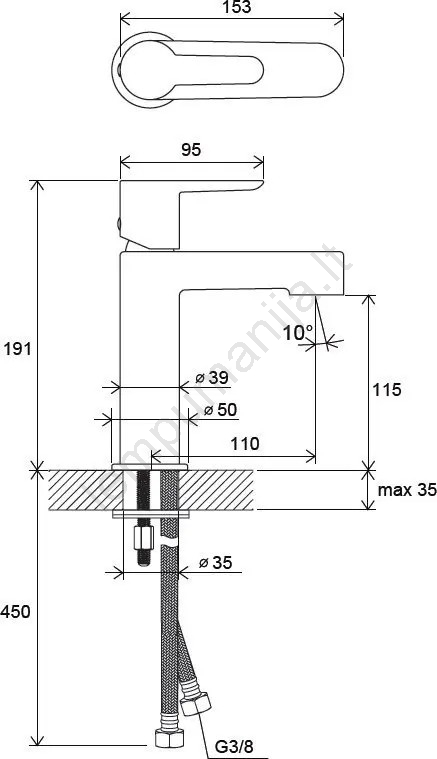 • Maišytuvas tiekiamas be išleidimo mechanizmo ir komplektuojamas su lanksčiomis 400 mm ilgio prijungimo žarnelėmis su G3/8 jungtimi.
